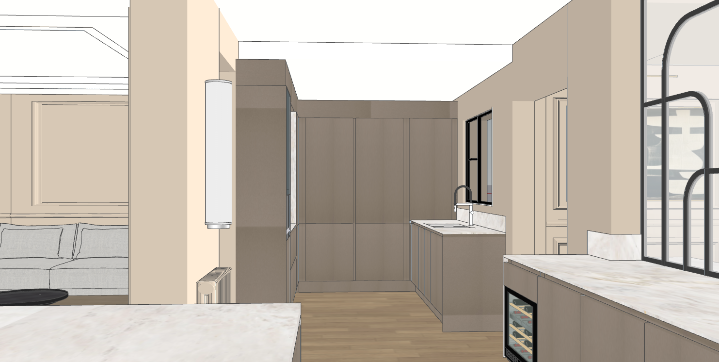 photorealistic architectural interior of a contemporary apartment kitchen and living area enhance the image without modifying the architecture or layout preserve all walls openings furniture positions and geometry warm neutral interior palette with smooth plaster walls in bone color and natural oak wood flooring contemporary kitchen with matte beige cabinetry natural stone countertop with subtle veining integrated appliances and minimal modern detailing in the living room area visible on the left maintain the recessed ceiling detail false ceiling drop with warm indirect led cove lighting creating a soft ambient glow washing the ceiling and upper walls warm 2700k indirect lighting black metal framed interior glass partition with fluted glass realistic reflections and light diffusion soft natural daylight entering through the kitchen window combined with warm indirect artificial lighting from the living room realistic global illumination soft ambient occlusion natural light bounce and balanced exposure interior architectural photography style realistic materials subtle imperfections natural color grading soft shadows high dynamic range ultra photorealistic architectural visualization image enhancement only no redesign no geometry changes maintain existing openings and architectural details