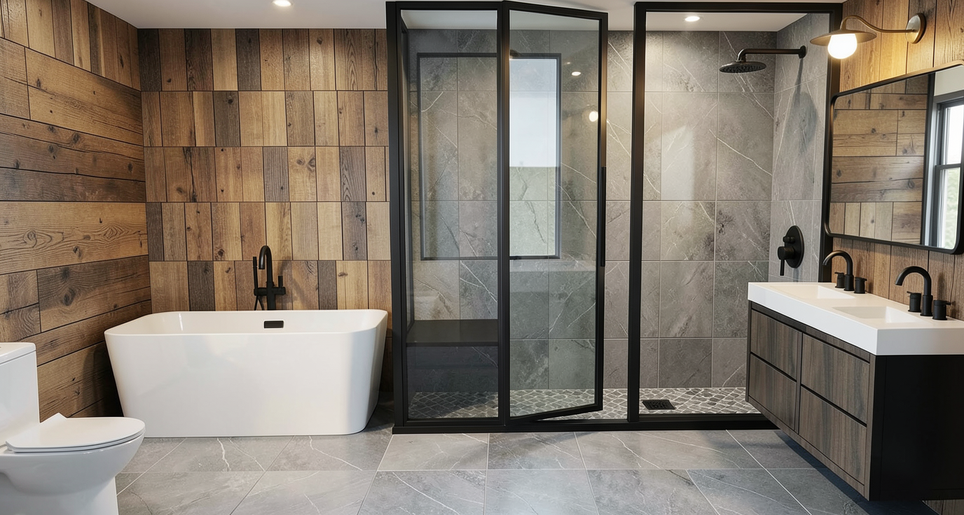 add modern charcoal wood shiplap to walls add grey tile to shower and floor