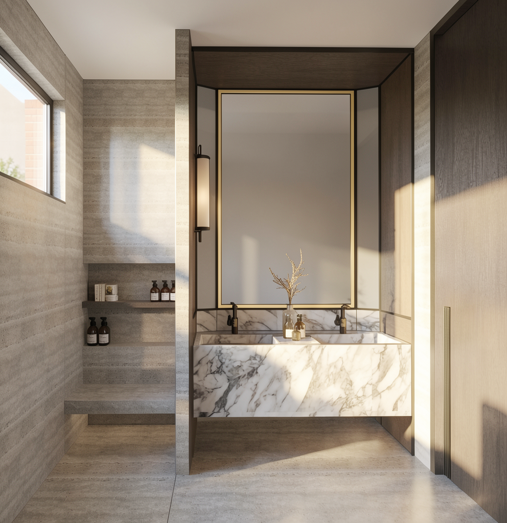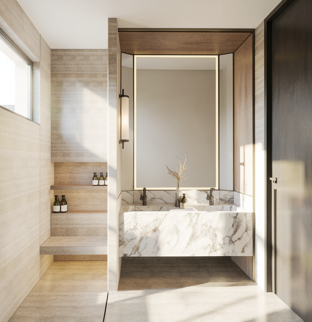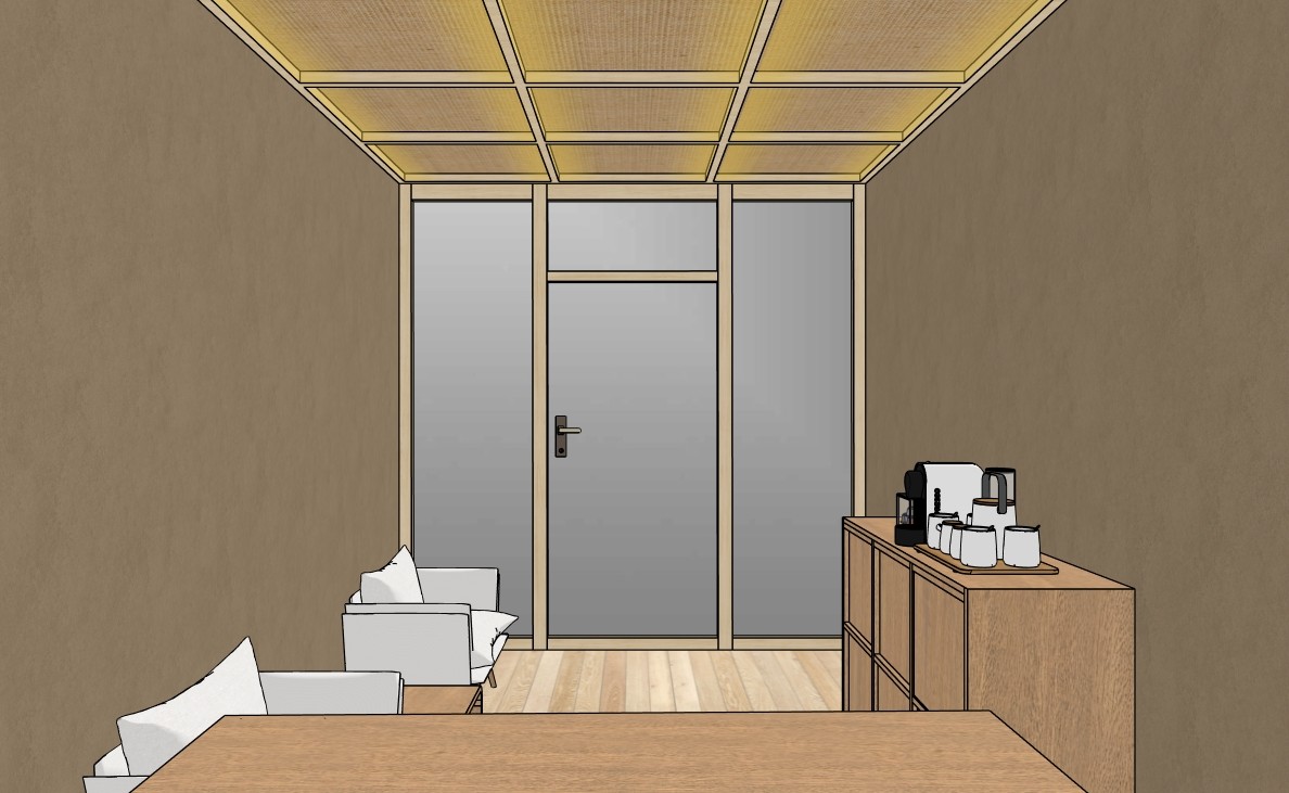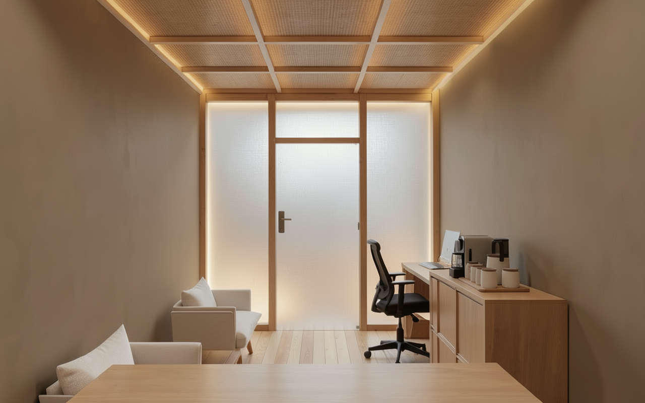 a calm zen japandi office lobby interior inside an industrial complex designed as a peaceful oasis office size is 4 1 x 2 3 meters with a ceiling height of 2 3 meters entrance features mirror glass panels mounted on vertical beech wood beams integrated with mirror doors the floor is made of light natural beech wood slats that continue seamlessly onto the back wall behind the camera creating a warm vertical rhythm side walls 4 1 m long are finished in warm taupe microcement with earthy clay undertones matte finish subtle texture calming yet slightly contrasting to the light beech wood ceiling includes minimal wooden slat details in matching beech tone soft white jute fabric panels with indirect warm backlighting are integrated into the design for a spa like atmosphere the space includes minimal ergonomic japandi sofa chairs and a small coffee station with a coffee machine and cups lighting is warm indirect and layered creating a serene lobby and wellness inspired feeling natural materials soft shadows tactile surfaces hotel like calm modern japandi aesthetic realistic proportions high realism no clutter