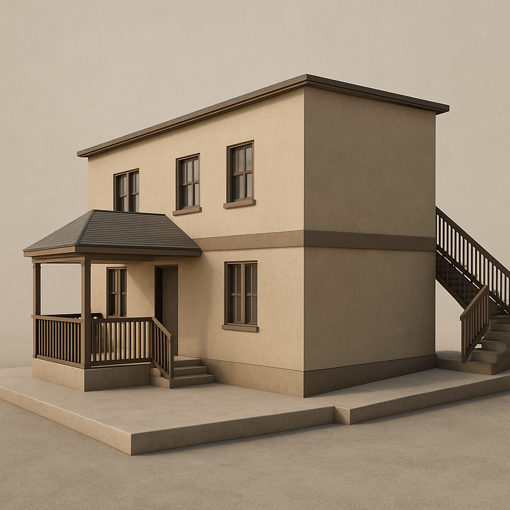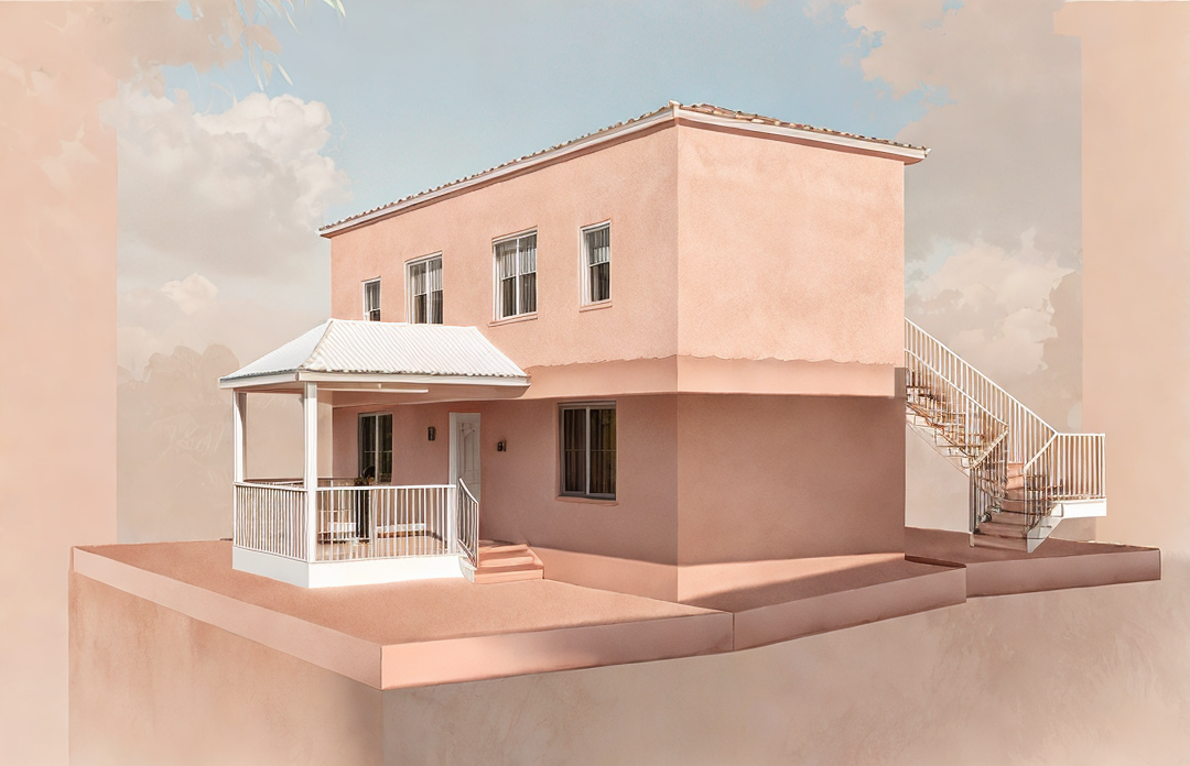 mediterranean revival exterior shot terracota roof tiles wood railings white plaster facade wood windows and doors add wood shutters in a olive and orange tree landscape with limestone pavement add some wall lighitngs in the facade dont change the architecture architecture