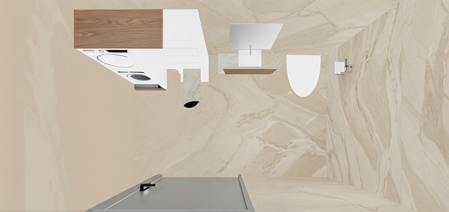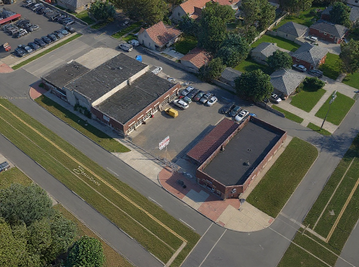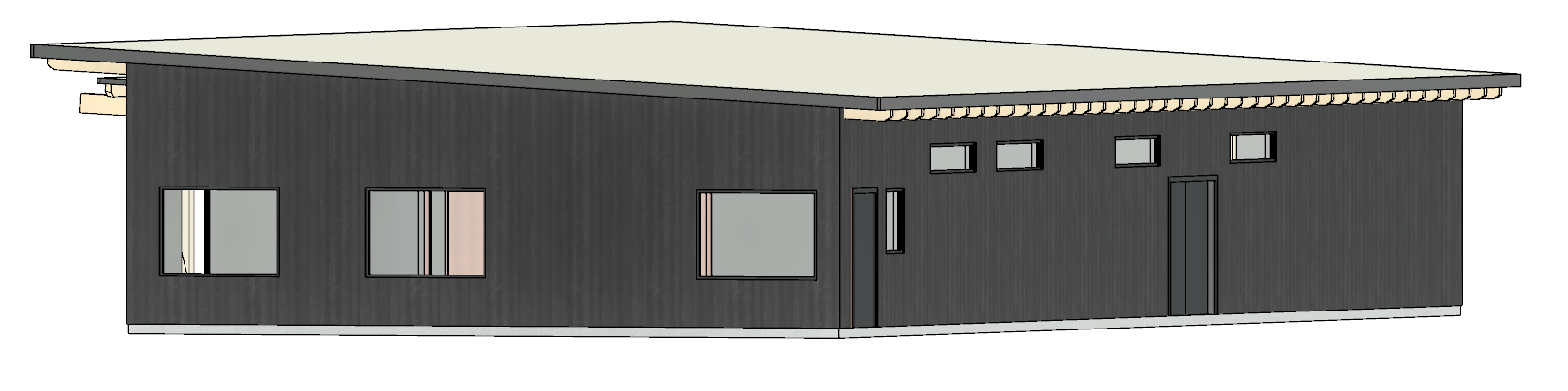 there are parking spots on the back side with a large in ground curbed planter on the left side of the building a tree line of pine trees is in the background about 100 feet in distance