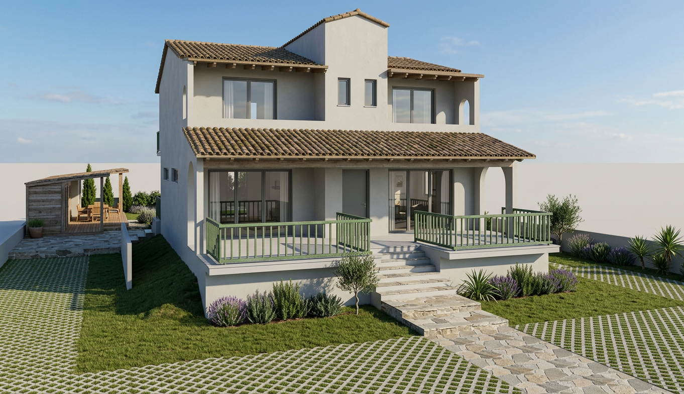 preserve the architecture structure lighting and camera angle of the original image exactly do not modify the house windows doors outdoor kitchen or patio structure landscape style modern luxury landscape design with clean architectural geometry layered planting and resort level outdoor living add outdoor living features lik outdoor dining zone near the outdoor kitchen luxury lounge furniture under the inspired by rh outdoor minotti outdoor near the windows