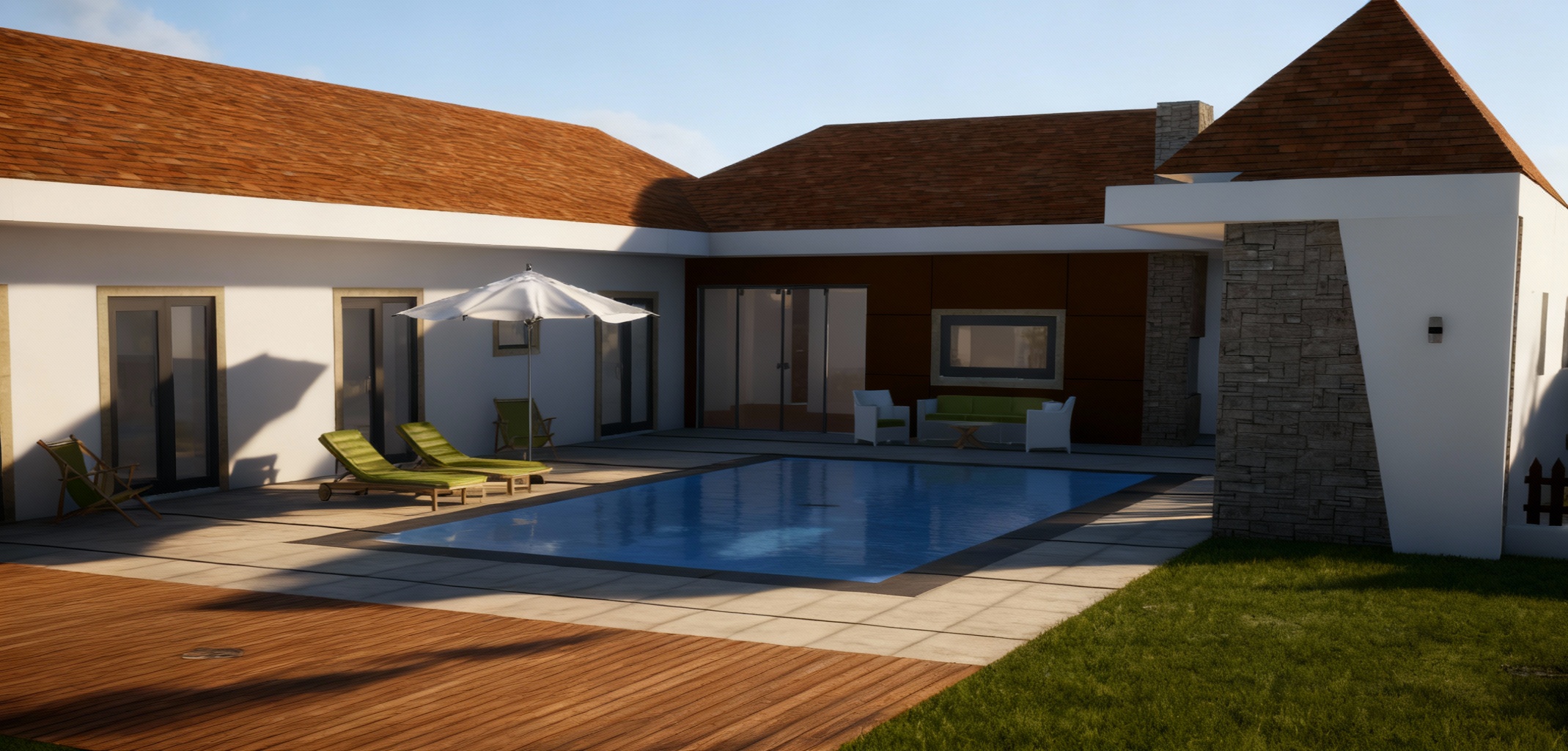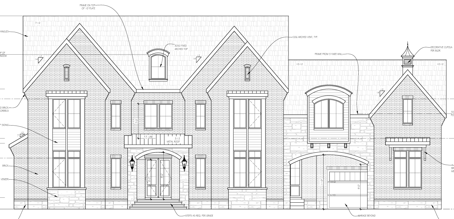 please render this home as a dark and moody palette please add landscaping like pin trees and ornamental grasses black windows and medium gray roof