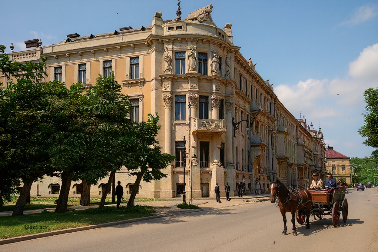 sunny day more hyperlight cinematic realistic rendering beautyful clouds 1900 s style dressing people coach cart with horses far away remove text from the picture