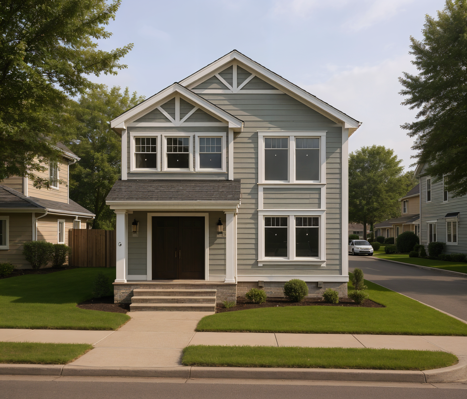 light gray siding with white window frame and white trim in gable under truss