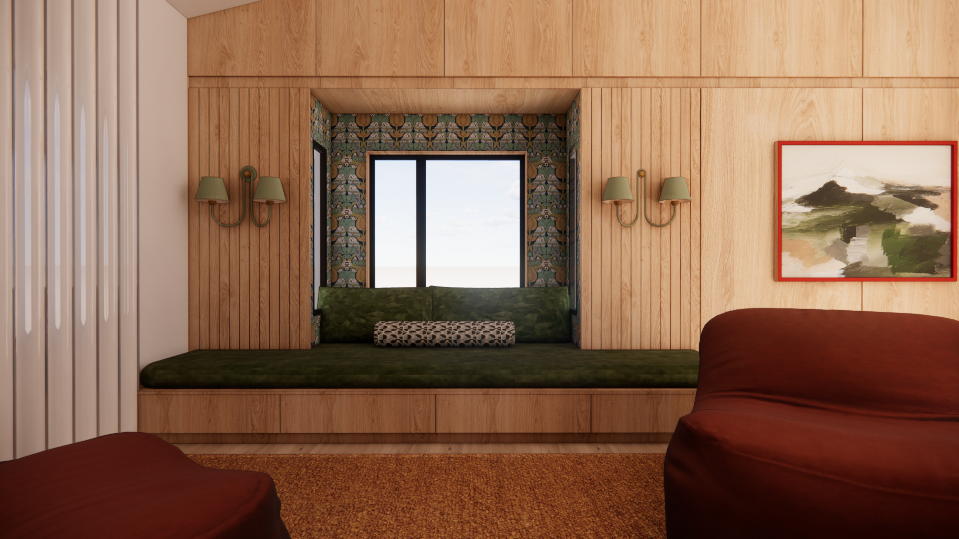 interior shot can you pur some trees in the background of the window and make the bench cushion blue velvet architecture