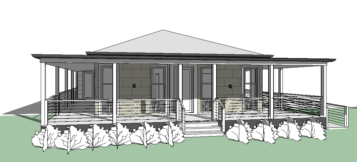colonial revival exterior shot country homestead with sandstone cladded walls zincalume roof dark grey features dark grey timber deck white posts and balustrade with wire bushland landscape behind building architecture