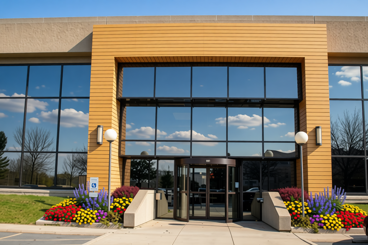 make the dark gray wood surround color matches the color of concrete walls make the wood clad surround 2 higher than the rest of building add modern light fixture on each side of the surround add to ornamental japanese maple tree on both side of entry cut around 2 feet of the length of concrete returning walls to widen up the entry add nicer colorful flowers in stead the existing