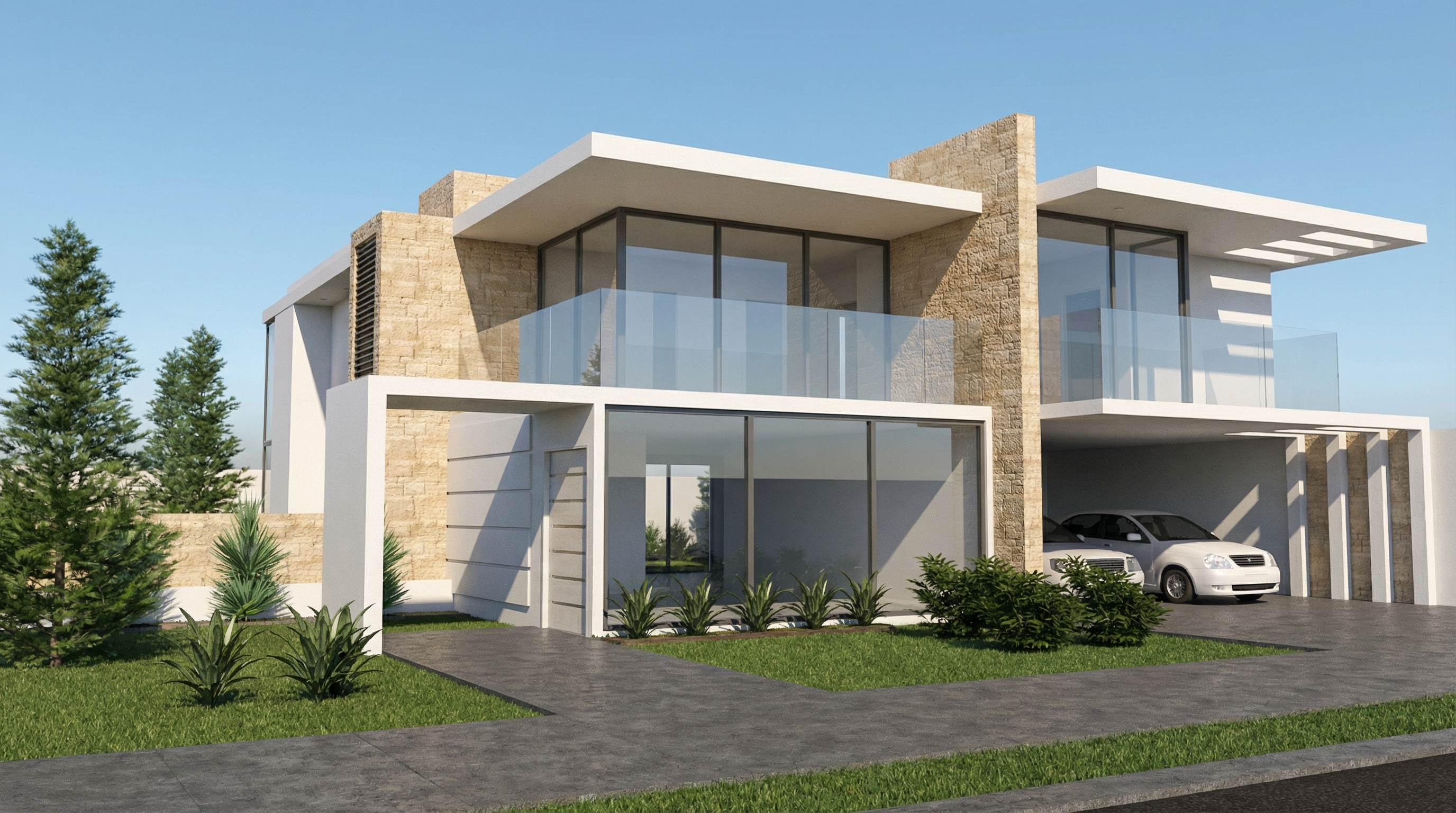 a charming modern house with a minimalist design the exterior features smooth beige lap siding walls complemented by a sleek dark gray slate metal gabled roof windows are framed in a black tone bringing contrast and sophistication surrounding this structure a serene environment bathed in soft natural light under a clear bright blue sky the atmosphere is peaceful and inviting evoking a sense of tranquility provide trees in the background add an inground pool