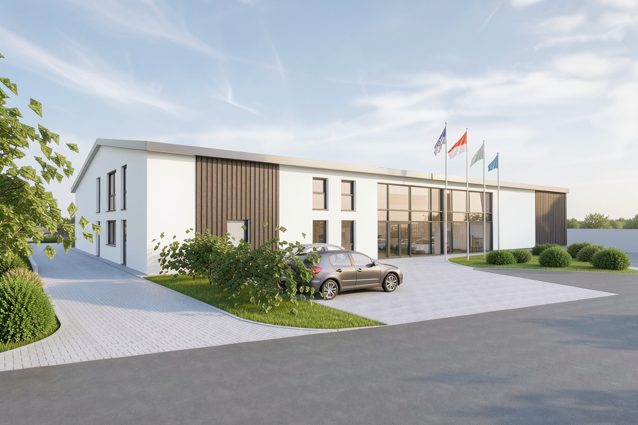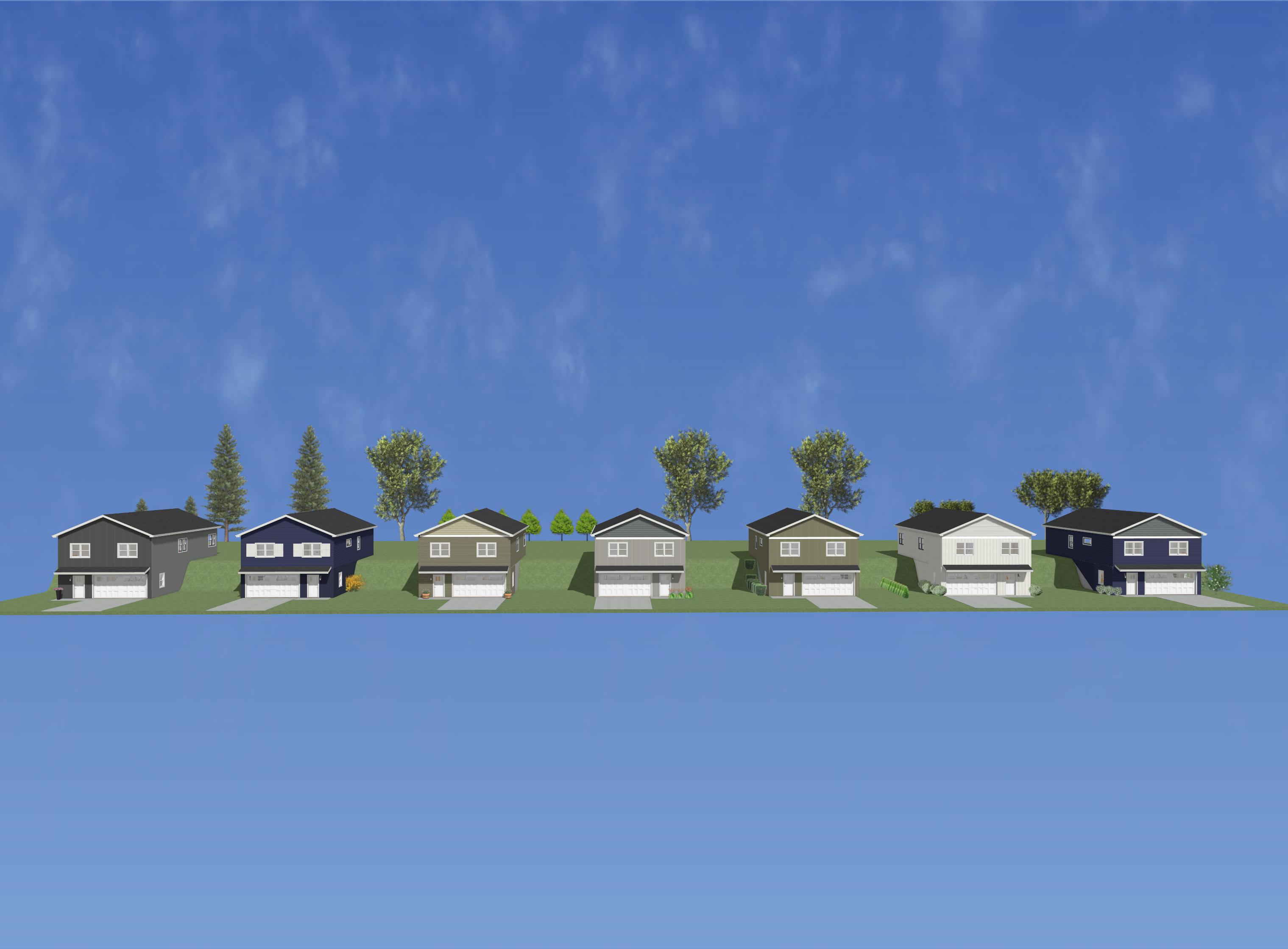a row of modern suburban houses lined up on a gentle slope each with a unique design the houses are painted in shades of gray and blue complemented by black rooftops lush green grass surrounds the homes dotted with trees in the background colored in rich leafy greens the sky above is a clear vibrant blue with soft wispy clouds scattered across creating a serene and peaceful atmosphere include bright afternoon sunlight casting soft shadows enhancing the tranquility and suburban charm the street in front of the driveways is paved with a sidewalk connecting each driveway