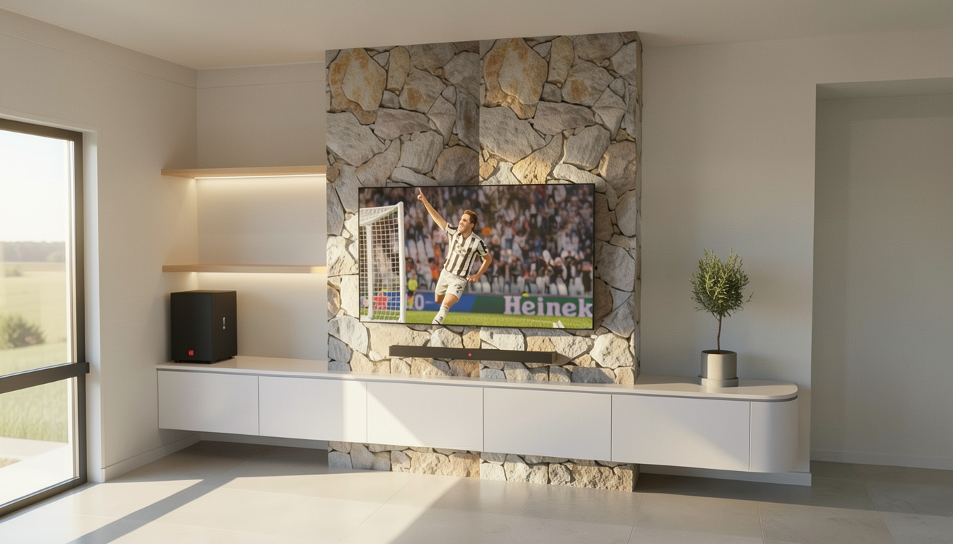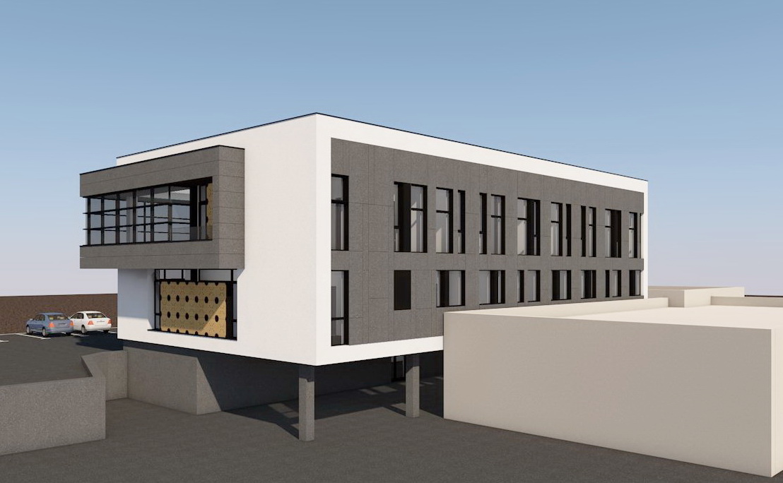 convert the image into a realistic outdoor photograph with professional architectural aesthetic maintaining 100 of the geometry and layout applying authentic materials afternoon warm lighting with soft shadows and a sharp photorealistic result add landscape design behind the building do not change material colors do not add hills or mountains in the landscape replace people with real persons