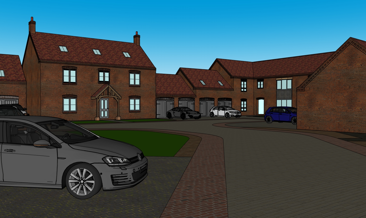 create an artist imperssion with planting to the outer edge of the grassed areas light grey windows and doors light rustic red roof pan tiles concrete pin curb edges to the road side set at same level because it shared surface light cloudy sky summer golden hour