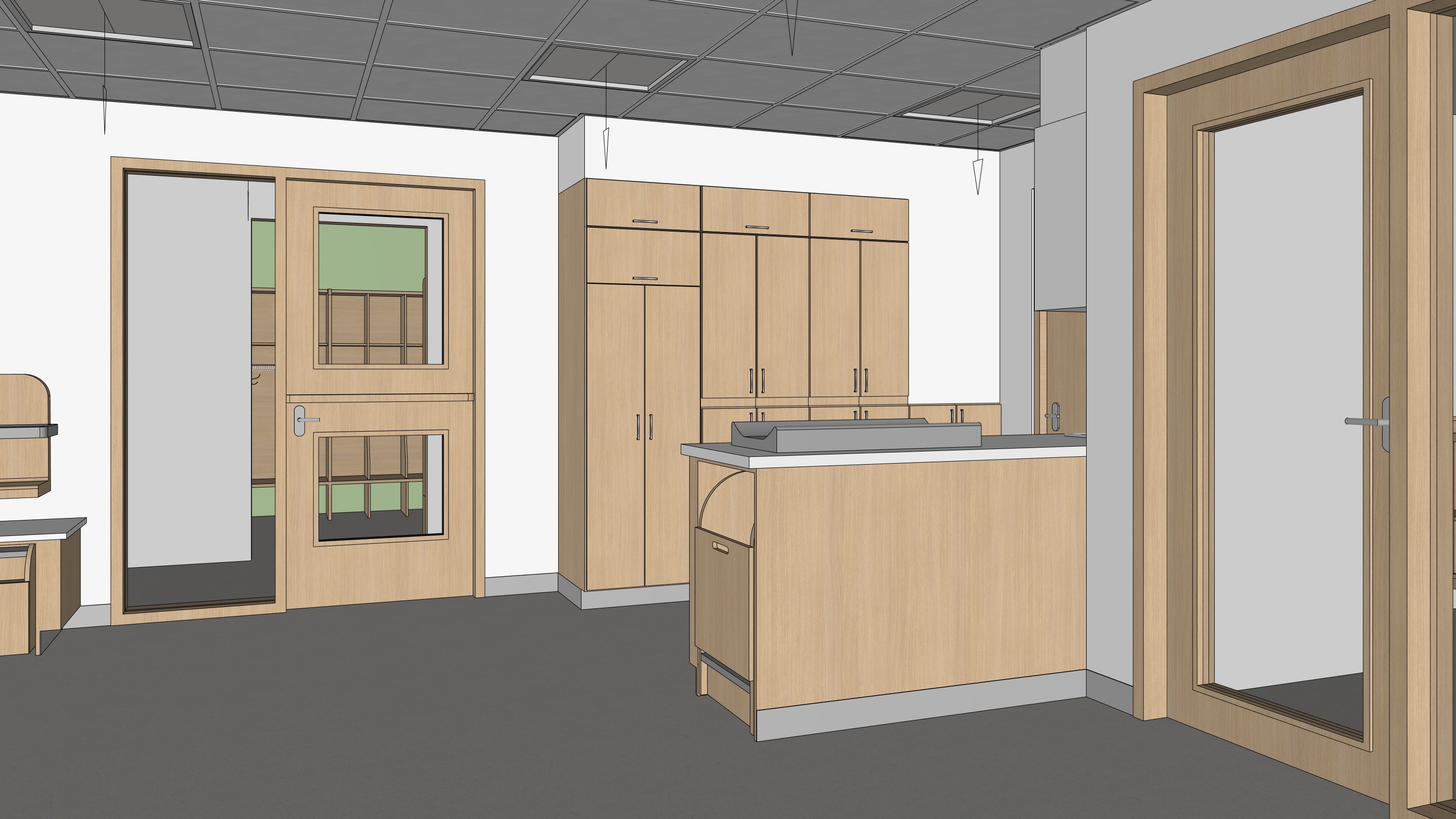 photorealistic architectural interior render of a childcare center cpe based strictly on the provided sketchup image do not add remove or modify any architectural elements furniture openings or layout keep all objects proportions and positions exactly as modeled all existing ceiling light fixtures must be turned on and emit soft realistic illumination combine artificial lighting with natural light if present keeping a balanced and believable exposure preserve the original colors and materials but enhance them with realistic textures accurate material properties and subtle imperfections wood grain fabric softness matte finishes child friendly clean calm and warm atmosphere suitable for a cpe environment realistic global illumination soft shadows correct scale neutral camera perspective no dramatic effects no stylization no artistic interpretation ultra realistic architectural visualization professional quality natural color grading no new furniture no extra decor no change in layout no change in wall positions no change in ceiling design no natural light from the doors glasses interior door all walls and ceiling must remain their orginal colors do not add new light fixture in the furniture do not change cabinets and furniture colors