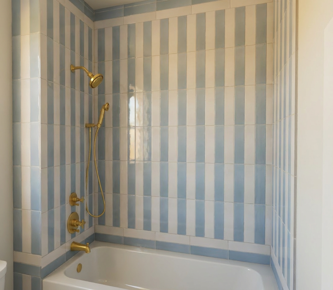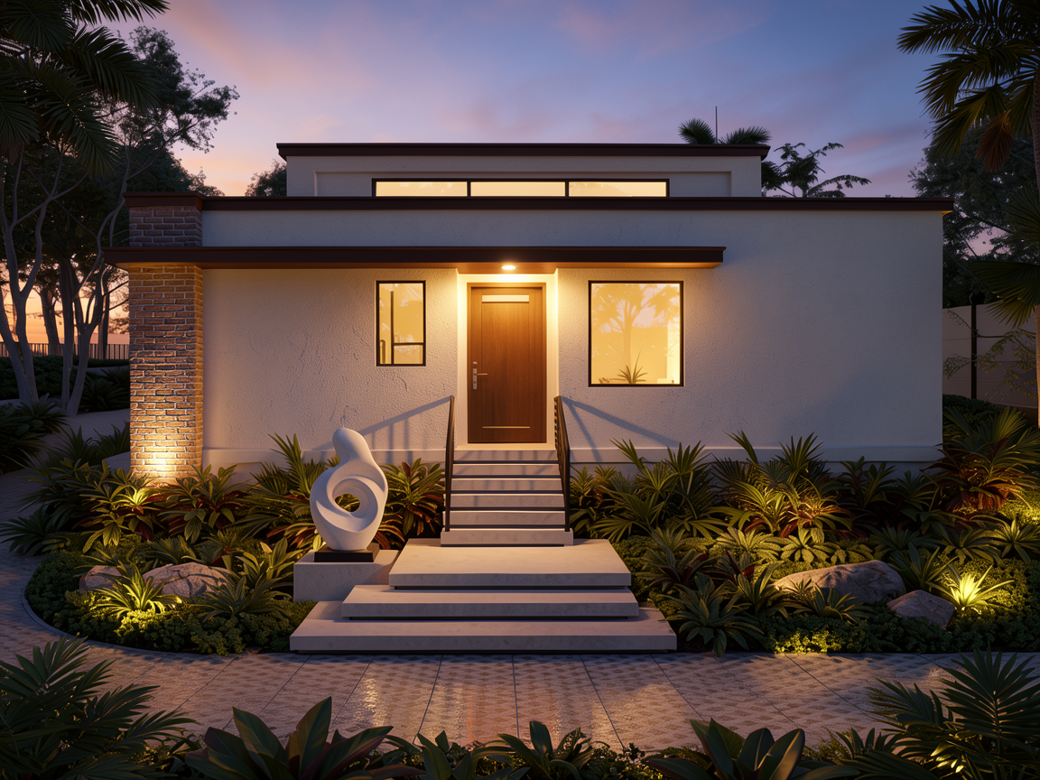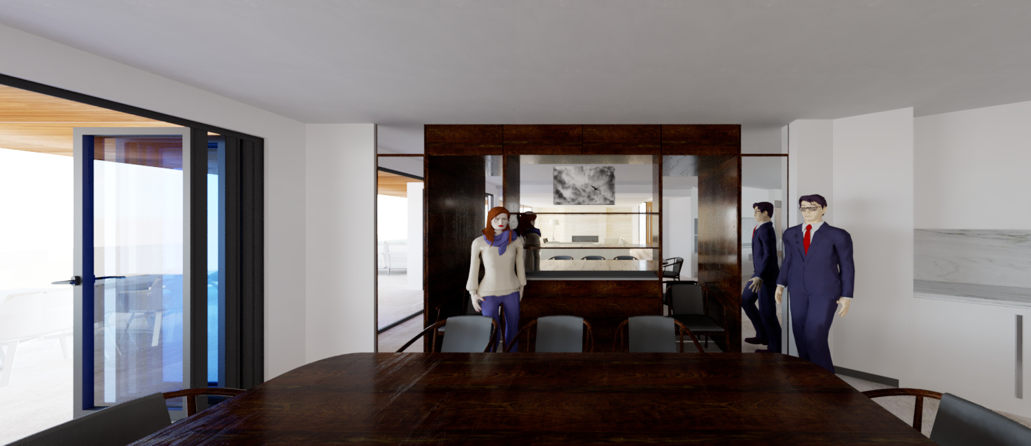 create a modern dining room and adjacent kitchen featuring a spacious walnut table surrounded by elegant walnut chairs with black leather cushions the atmosphere is warm and inviting enhanced by rich walnut and glass mirror cabinetry and there is an ocean view reflected in the glass mirror incorporate white walls and a light marble backsplash in the kitchen the kitchen cabinets are a white satin finish and color natural light to flood in a bright airy feel the floor is light stone tile complementing the neutral palette