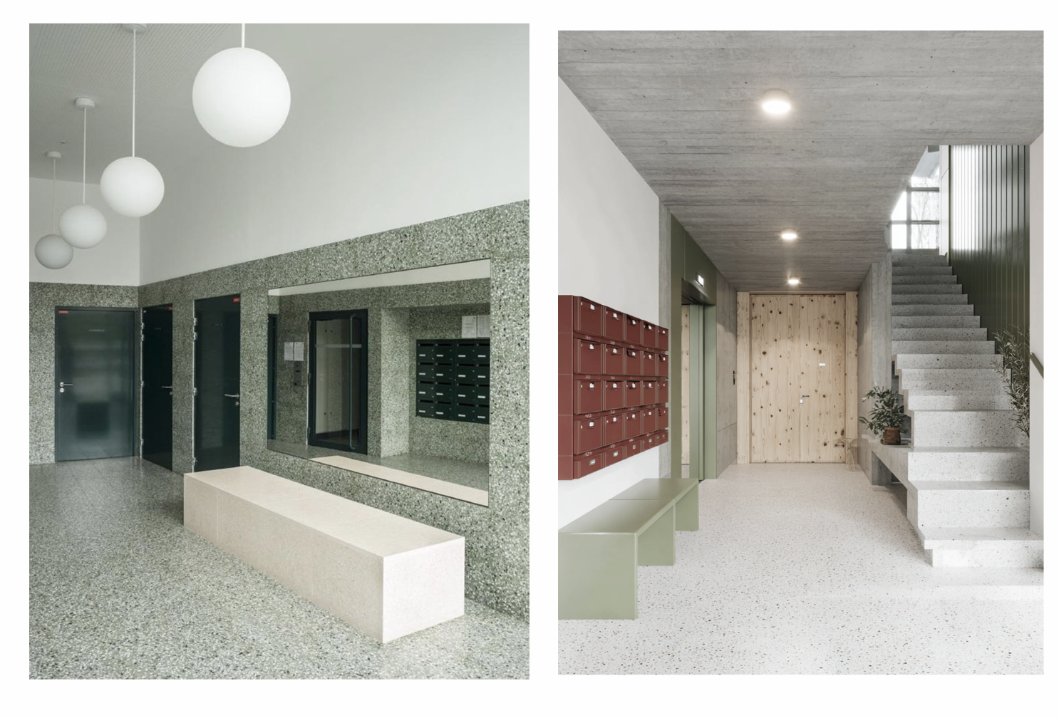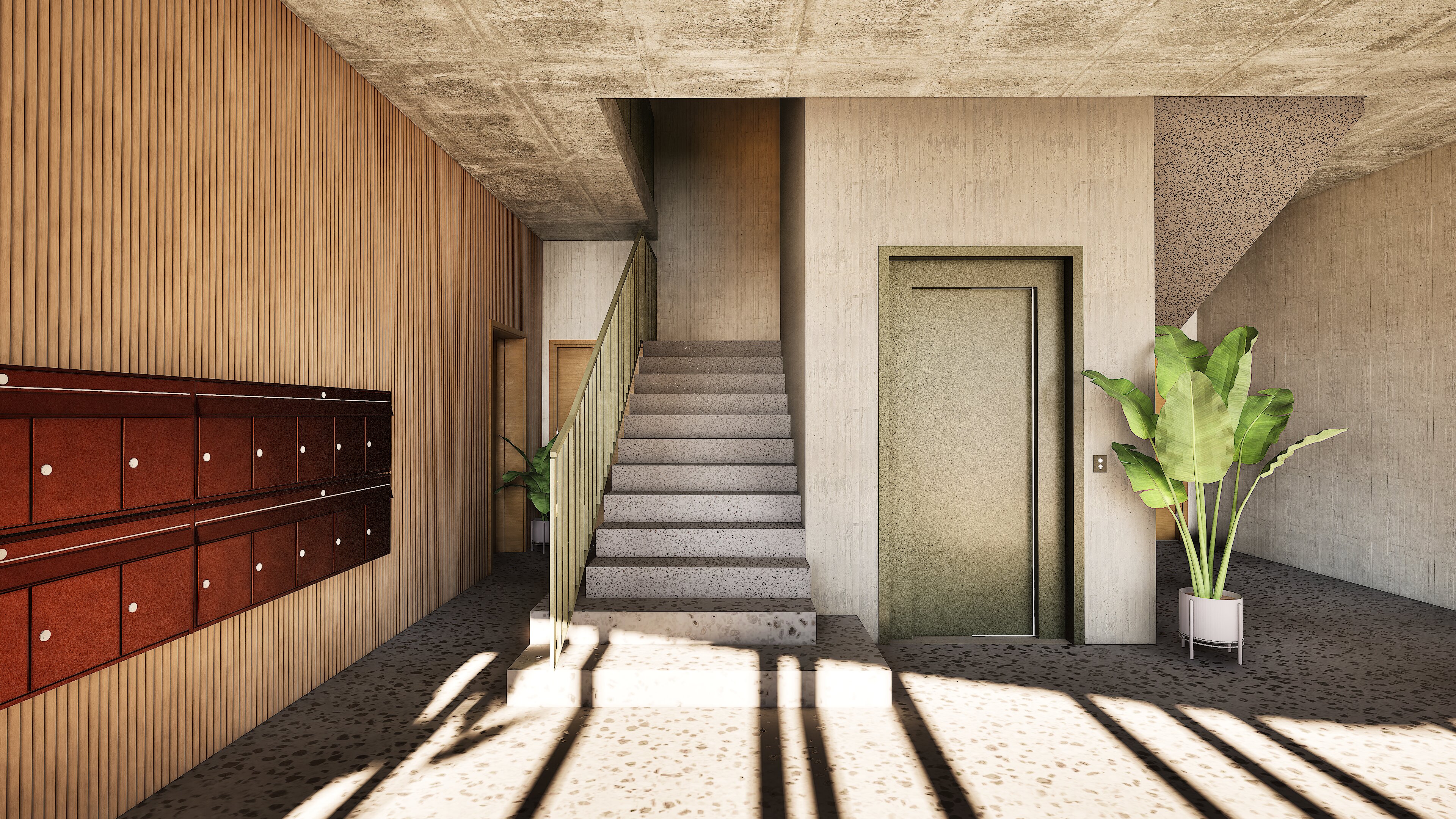 interior shot upgrade interior with green terrazzo wall cladding on the left deep burgundy mailboxes the stair is concrete the elevator door deep metal green just as stairs railing the flooring is terrazzo