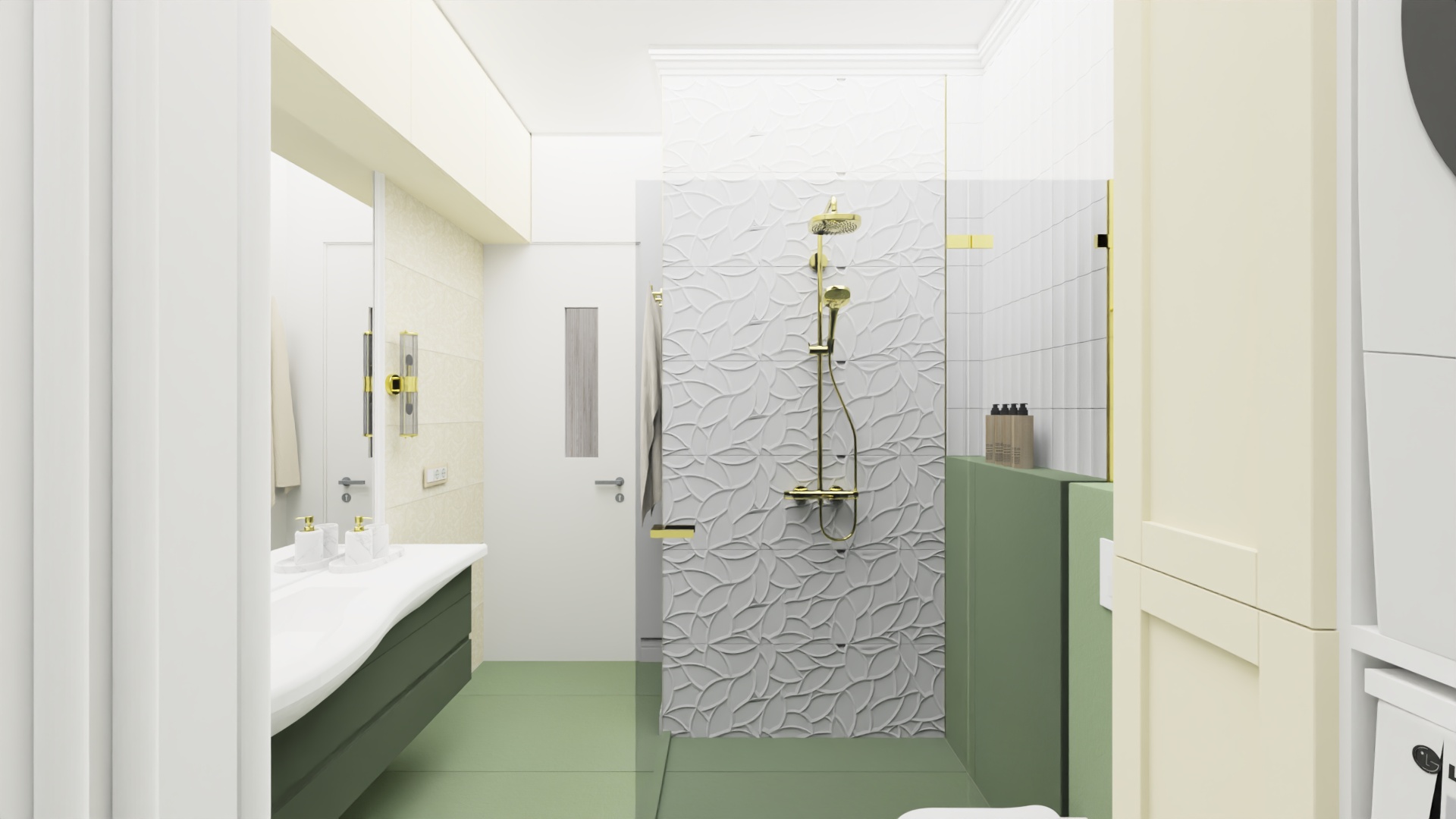 create a render in hyper realistic architectural visualization quality 8k resolution all objects furniture sanitary ware and architectural features must remain in place do not add any objects or delete anything from the image the spatial configuration must remain unchanged warmth gentle reflections soft shadows enhanced color richness and luxurious level realism improve depth and realism through laminated grain richness brass highlights ceramic texture and polished clarity while keeping the entire scene exactly as originally designed use a smooth white wall surface around the white door a luxurious and serene bathroom featuring a glass shower enclosure with white tiles and brass fixtures complemented by a textured green cermic floor the vanity has a porcelain sink and laminated green cabinets the atmosphere is calm and inviting
