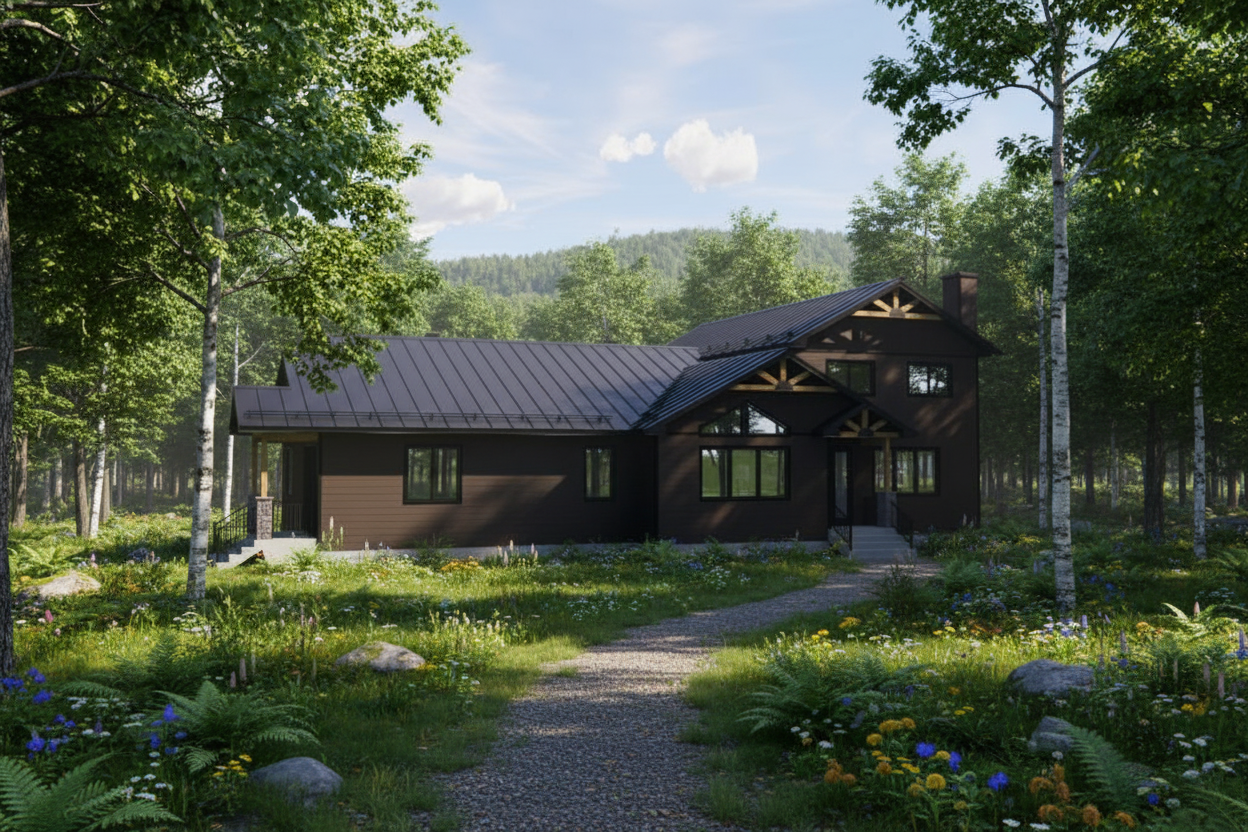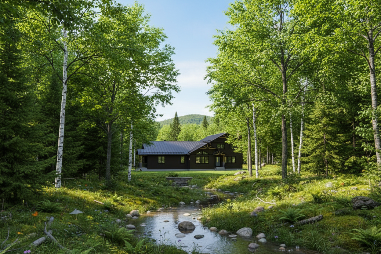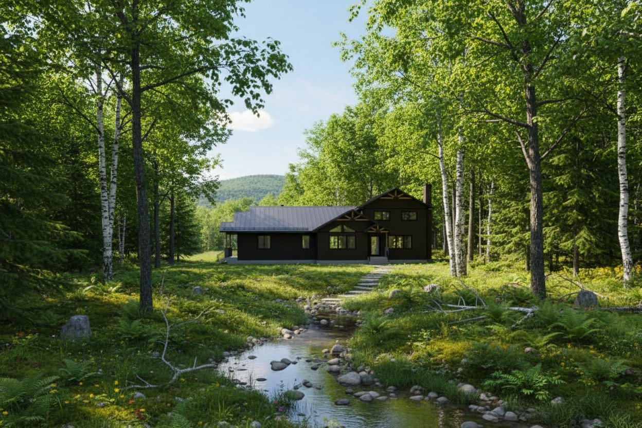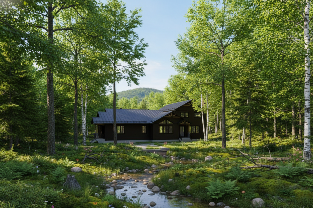 ultra realistic 4k render house in a forest in mont tremblant summer at midday black wooden cladding terrain drops on the left and rear side after the balcony