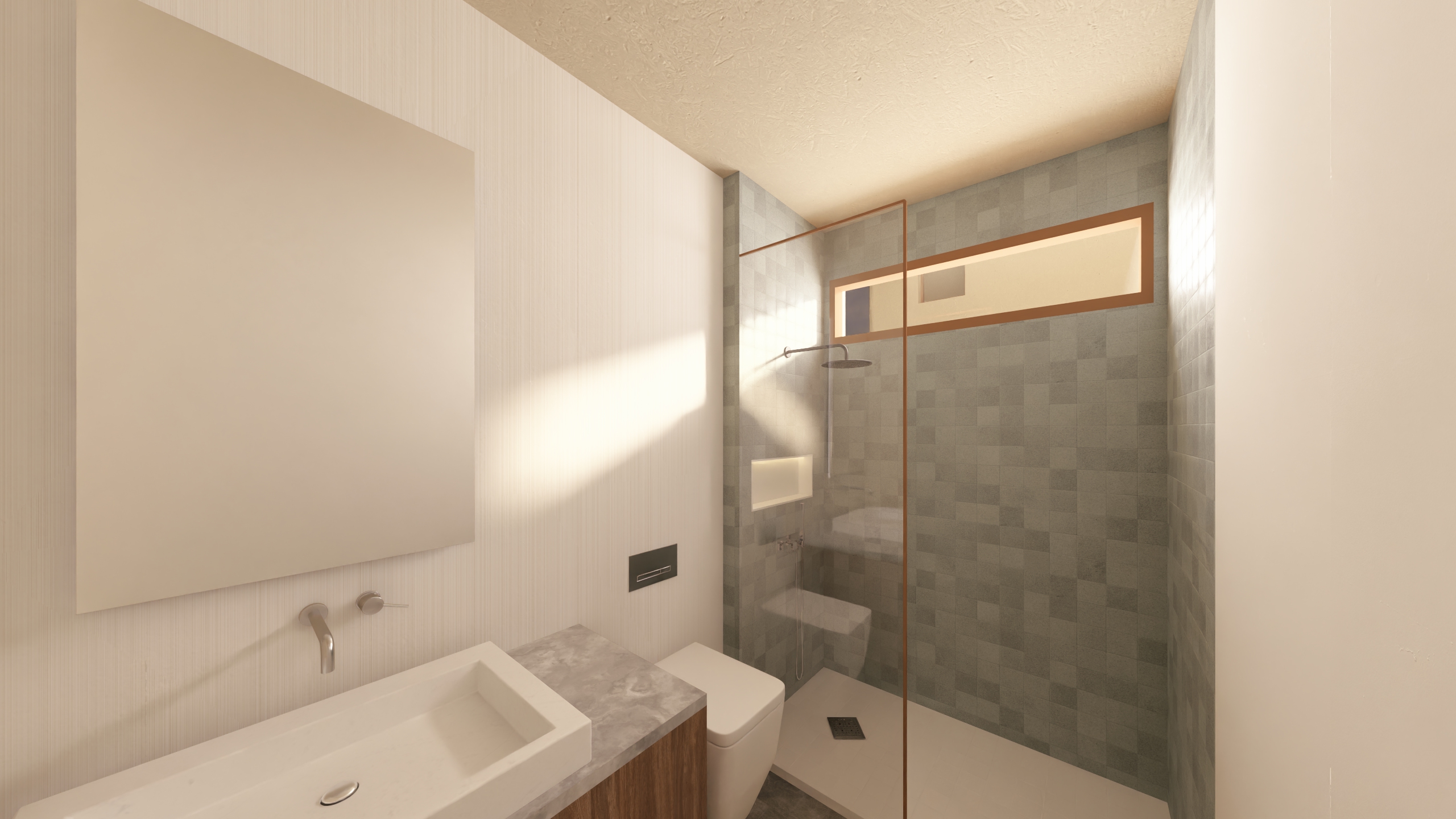 1 paredes base estuco lime plaster textura normal map sutil para resaltar imperfecciones del estuco color blanco roto beige o arena c lido shader diffuse con ligera rugosidad specular muy bajo mate opcional z calos o salpicaderos de azulejos artesanales handmade tiles en reas h medas usando mapas de textura y bump para microrelieve 2 suelo material terracota envejecida o piedra natural travertino textura tileable para cubrir el piso usar displacement map para resaltado de juntas y texturas color tonos c lidos crema arena terracota shader roughness alto specular bajo slight bump para rugosidad natural 3 muebles carpinter a material madera envejecida por ejemplo roble o pino lavado textura grain natural con variaciones de tono shader slightly glossy oil waxed pero sin brillo artificial roughness medio detalles manejar microvariaciones de color y desgaste natural 4 textiles material lino y algod n natural shader soft cloth shader roughness alto translucency bajo para toallas color blanco roto arena beige mantener minimalismo y suavidad 5 cer mica y decoraci n material cer mica artesanal o barro shader slight gloss sutil imperfecci n en la superficie bump o normal map color terracota c lidos neutros o azul pastel muy suave 6 iluminaci n natural mantener la luz que viene de ventanas directional area light ambient led warm tone baja intensidad simular tiras led indirectas bajo muebles o detr s de espejos efecto resaltar textura de paredes y materiales naturales sin cambiar la composici n 7 decoraci n opcional peque as plantas resistentes a la humedad helechos lavanda suculentas en macetas de barro cestas de fibras naturales objetos peque os de cer mica toallas o pa os de lino doblados o colgados discretamente a ade elementos decorativos a la imagen como cepillos de dientes jaboneras algun cuadro sobre el inodoro
