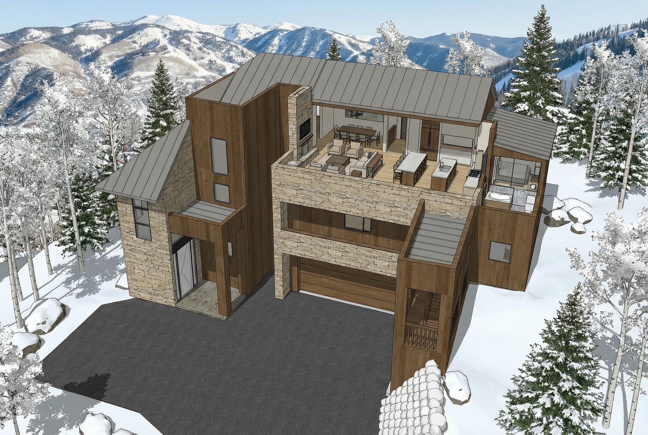 maintain existing geometry and location of materials make the wood siding less rustic add in landscape features for snowmass co where stone is shown use colorado buff limestone veneer stone maintain the driveway as asphalt