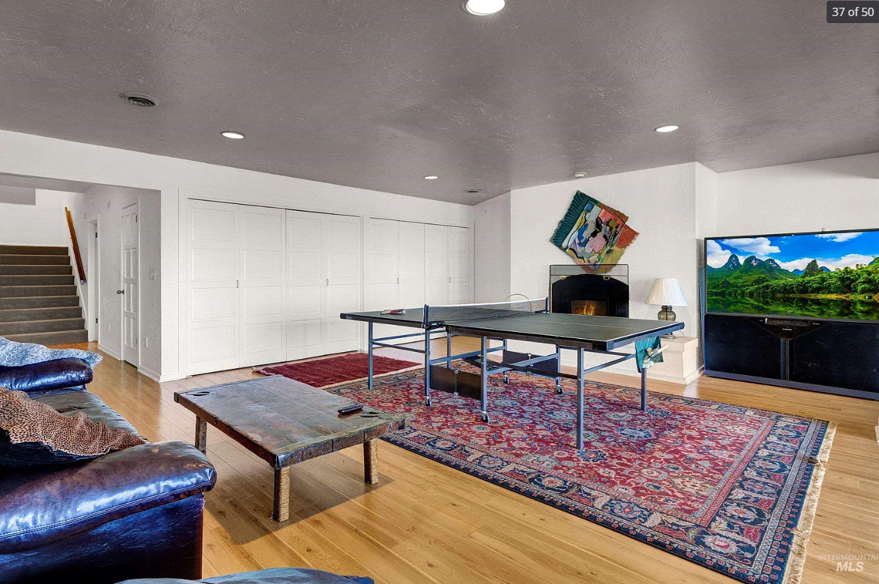 add a bar at closet doors and replace all furniture with pool table and lounge seating