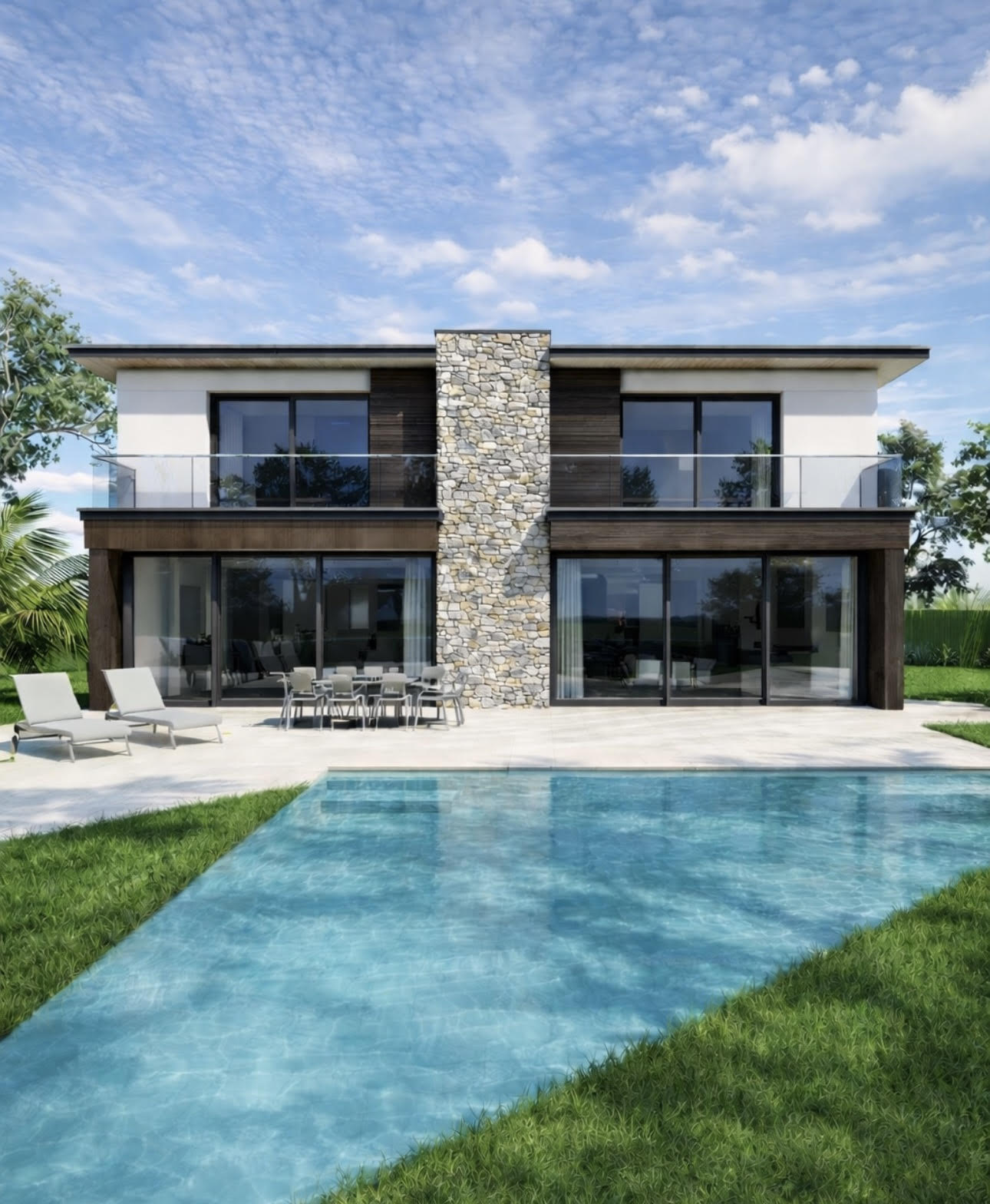 exterior shot respect exactly and architecture but possible to change materials make it charming with furnitures and accessories