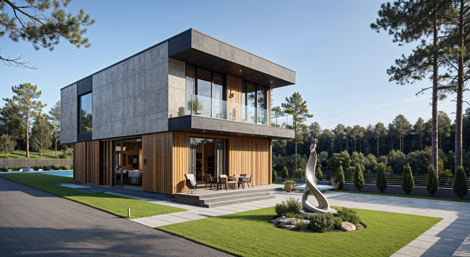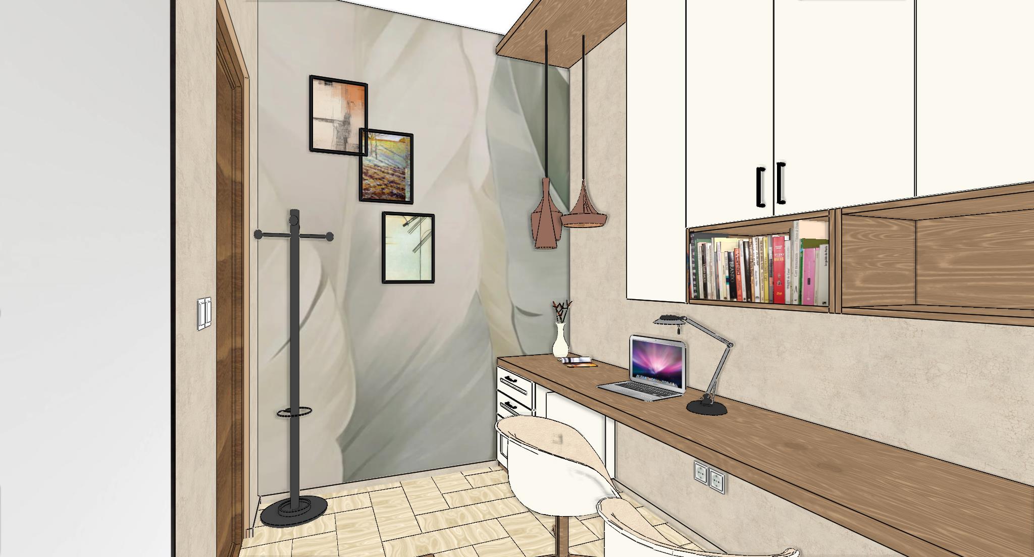 a realistic interior render of the home office the style is modern with a soft matte finish on all surfaces to avoid gloss or glare the overall color palette is warm and earthy on the far left wall there is a dark wood door next to a matte black freestanding metal coat stand the main back wall features a large textured mural tapestry with abstract soft green and beige drape motifs hanging above the center of this wall are three framed abstract artworks with matte black frames below the mural is a long built in floating desk made of matte finish light oak wood two modern matte white and soft beige upholstered chairs are pulled up to the desk the desk top holds a matte finish dark metal adjustable table lamp a closed laptop with a non reflective screen and a small matte vase with simple twigs along the right wall there are upper cabinetry units with matte white fronts and simple matte black handles below the cabinets is an open matte light oak shelf filled with a variety of books with matte paper spines hanging above the desk area on the right are two ceramic pendant lamps in a textured matte brown terracotta finish the entire flooring is covered with a matte light wood plank pattern the lighting is diffused and even showcasing the textures without creating specular highlights