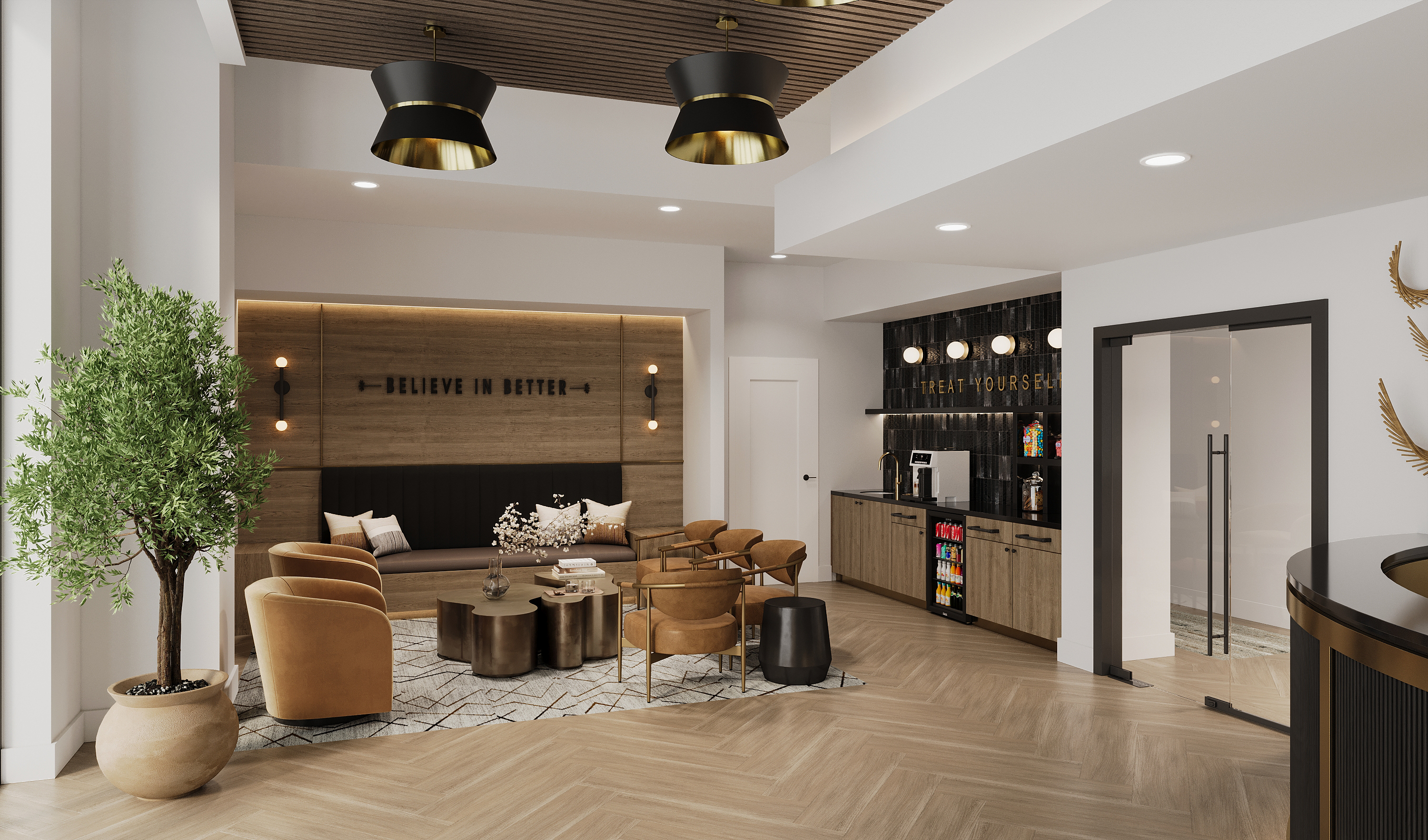 modernist improve this rendering to look like a modern hotel lobby architecture