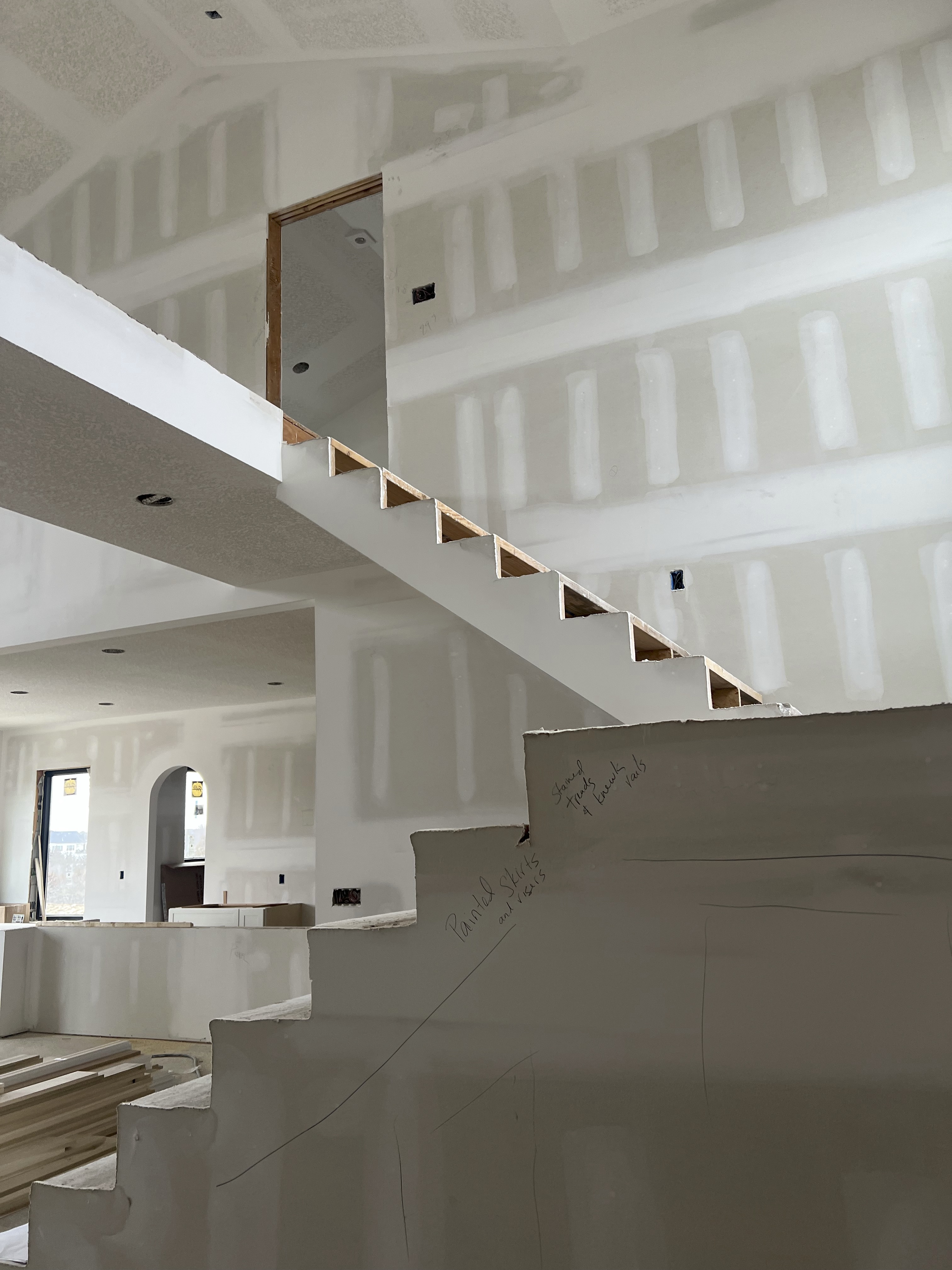 add finished drywall and picture frame molding to the walls ending 6 below the top of the upstairs doorway