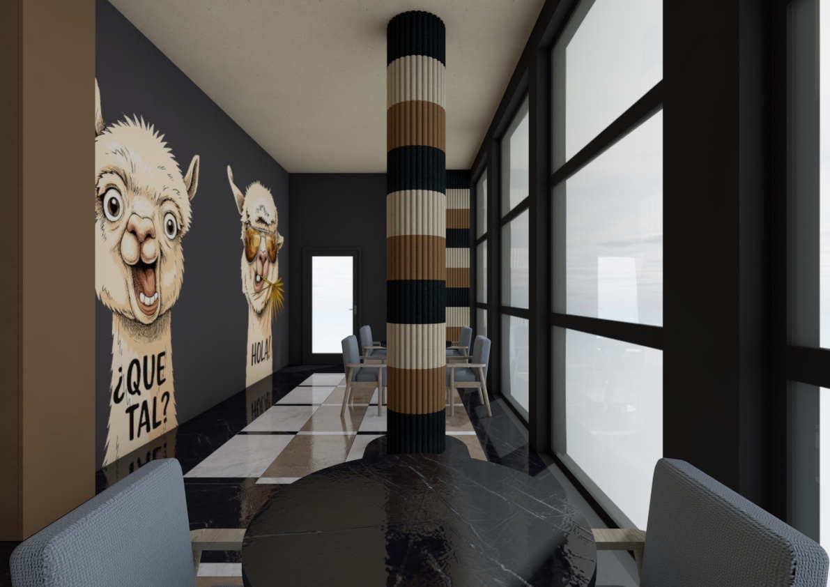 interior view of a modern restaurant keeping all existing architectural and furniture elements exactly as they are nothing is to be altered enhance textures materials and atmosphere add chrome mushroom shaped table lamps on every table 35 cm tall 20 cm shade centered casting warm soft light 2700k above the bar add matching chrome pendant lights evenly spaced 60 cm apart at 80 90 cm above the counter emitting warm ambient light ceiling remains unchanged integrate warm led light 2700k only along existing contours providing soft diffuse illumination without adding any new elements or spotlights beige paneled wall made of 3d printer filament is intact with a centered minimalist painting 120 cm 80 cm atmosphere is warm inviting sophisticated with soft diffuse shadows highlighting material realism and textures camera angle at eye level showing tables bar and background wall emphasizing harmony and cozy ambiance