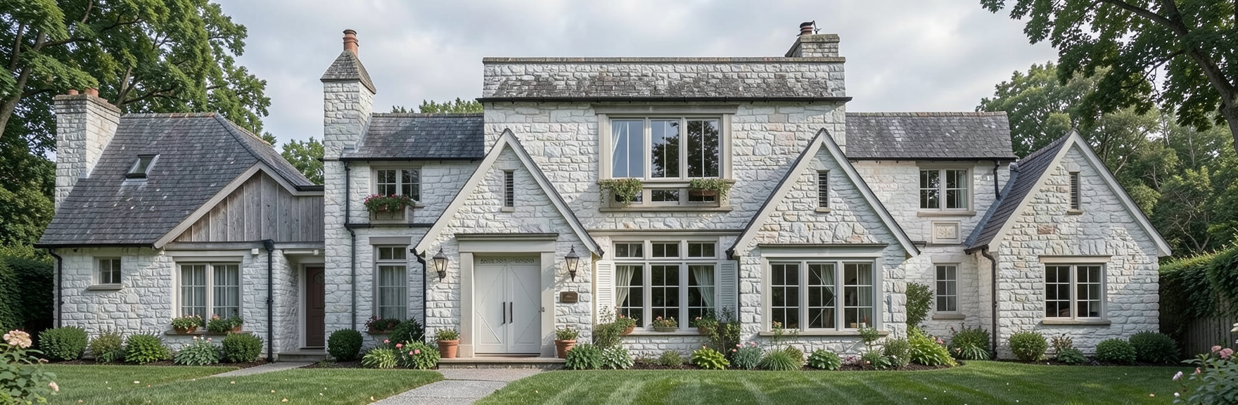 romantic scandinavian cottage with white ashlar stone instead of brick grey tones not brown