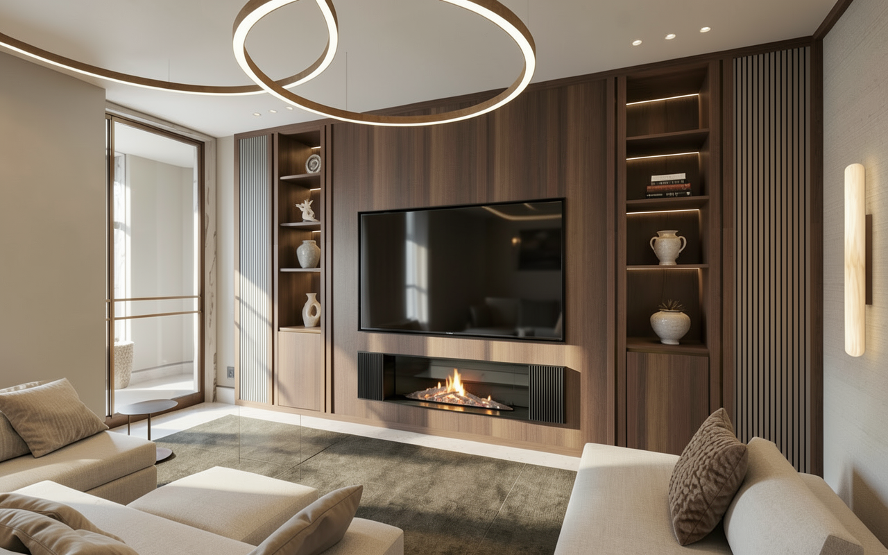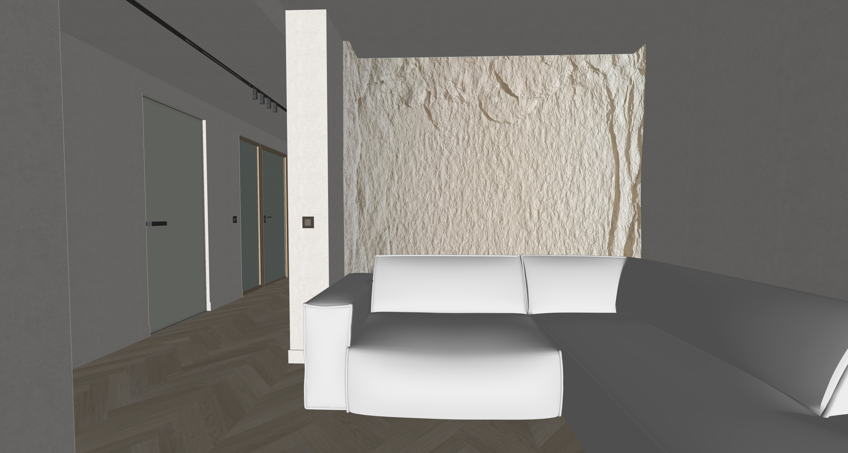 keep exactly the same geometry make materials more realistic make lighting more realistic all walls and ceiling have beige texture all fabric have beige and earthy tones add hidden led light around the ceiling behind the sofa there is a natural rock cladding in beige tone