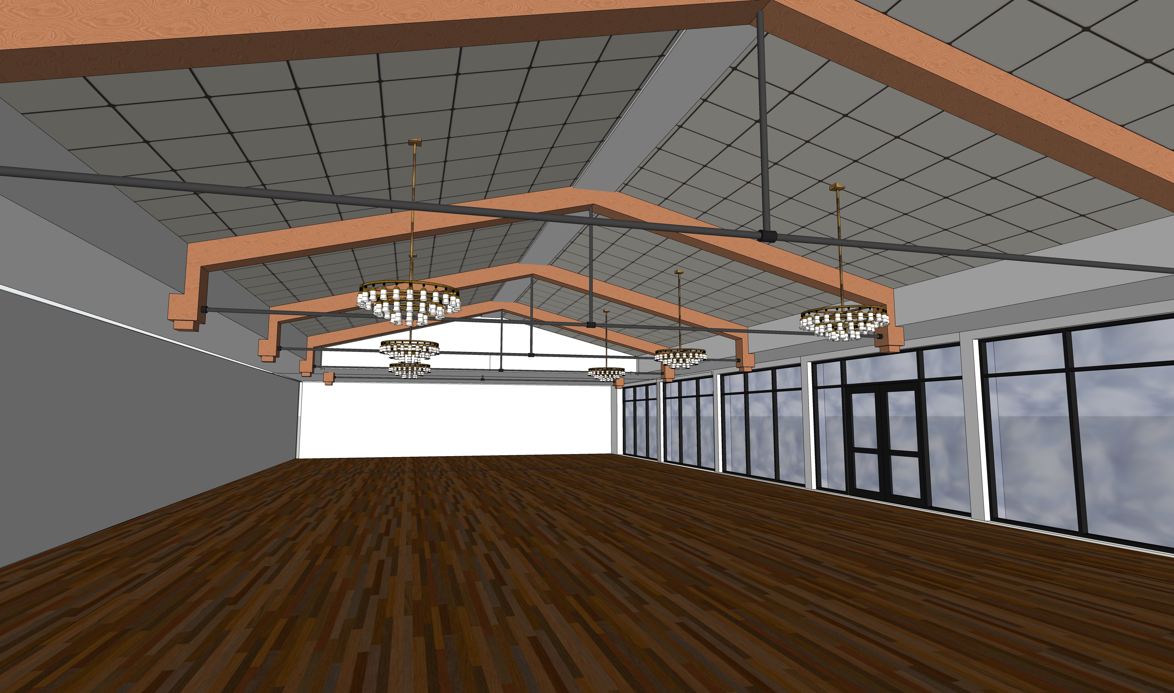 a spacious and elegant ballroom with high ceilings and large windows the ceiling beams are rich oak with a warm natural grain texture the chandeliers cast a soft golden light across the room the floor is polished dark walnut reflecting the ambient light softly the walls are a classic dove gray complementing the sophisticated atmosphere through the windows a serene view of a sunset on the water with soft clouds is visible enhancing the airy and relaxing ambiance