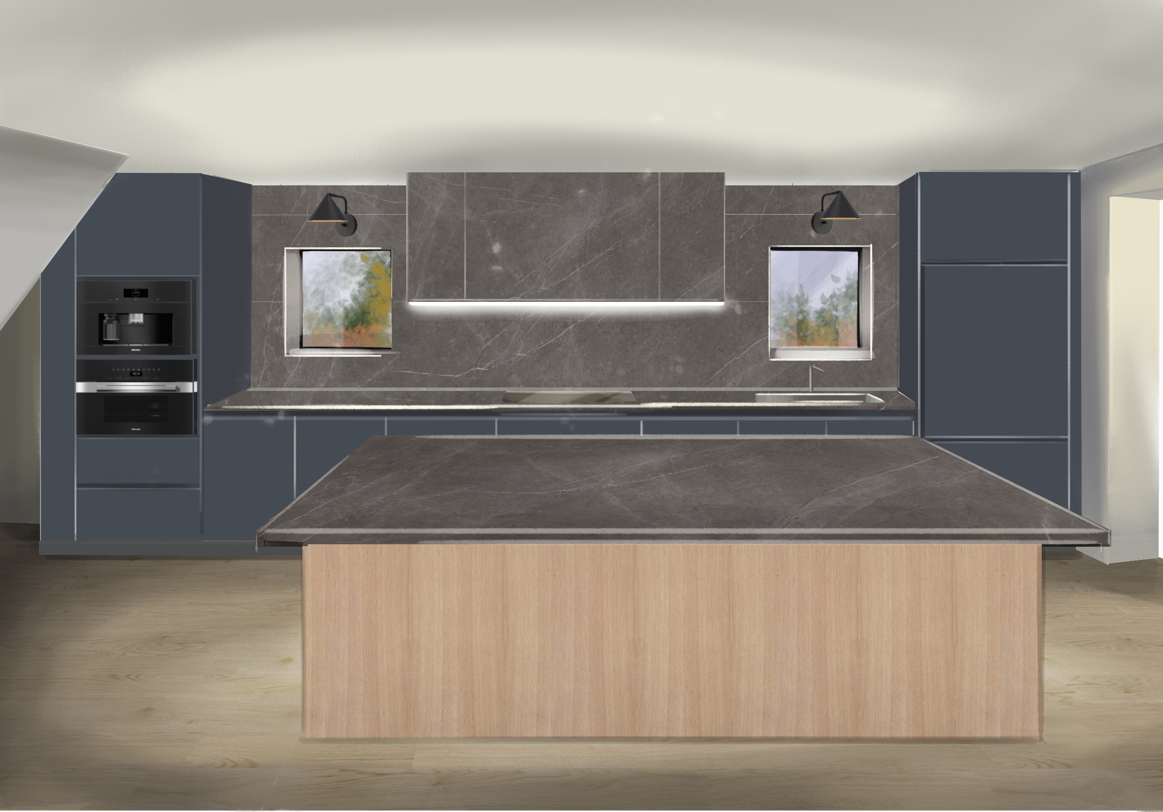 black sconces above the windows uppers same colour and texture as backsplash soapstone with led strip under upper no recepticals on backsplash