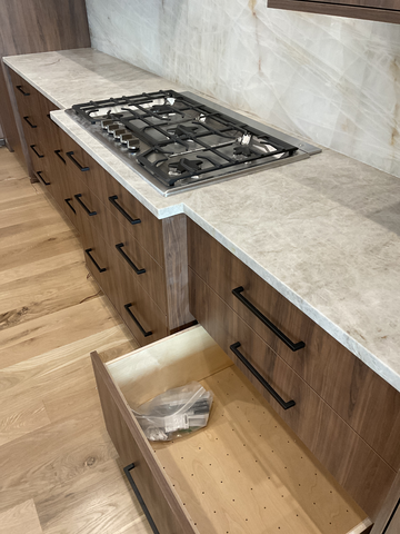 do not change the cabinets in any way preserve the exact cabinet colors materials finishes dimensions door and drawer styles hardware spacing alignment and all geometry exactly as shown do not alter the countertop shape backsplash appliances flooring lighting fixtures or wall structure only remove the construction materials clutter and mess from the scene clean the room and make it look finished and staged add a few simple tasteful home accessories appropriate for the style of the space but do not add or remove any furniture windows or architectural elements maintain the original lighting direction and realism enhance clarity and polish the photo while keeping the cabinetry and room design completely unchanged do not alter the lighting to keep the cabinet colors as they are in the image stage the countertop for a minimalistic kitchen add white bowls inside the drawer