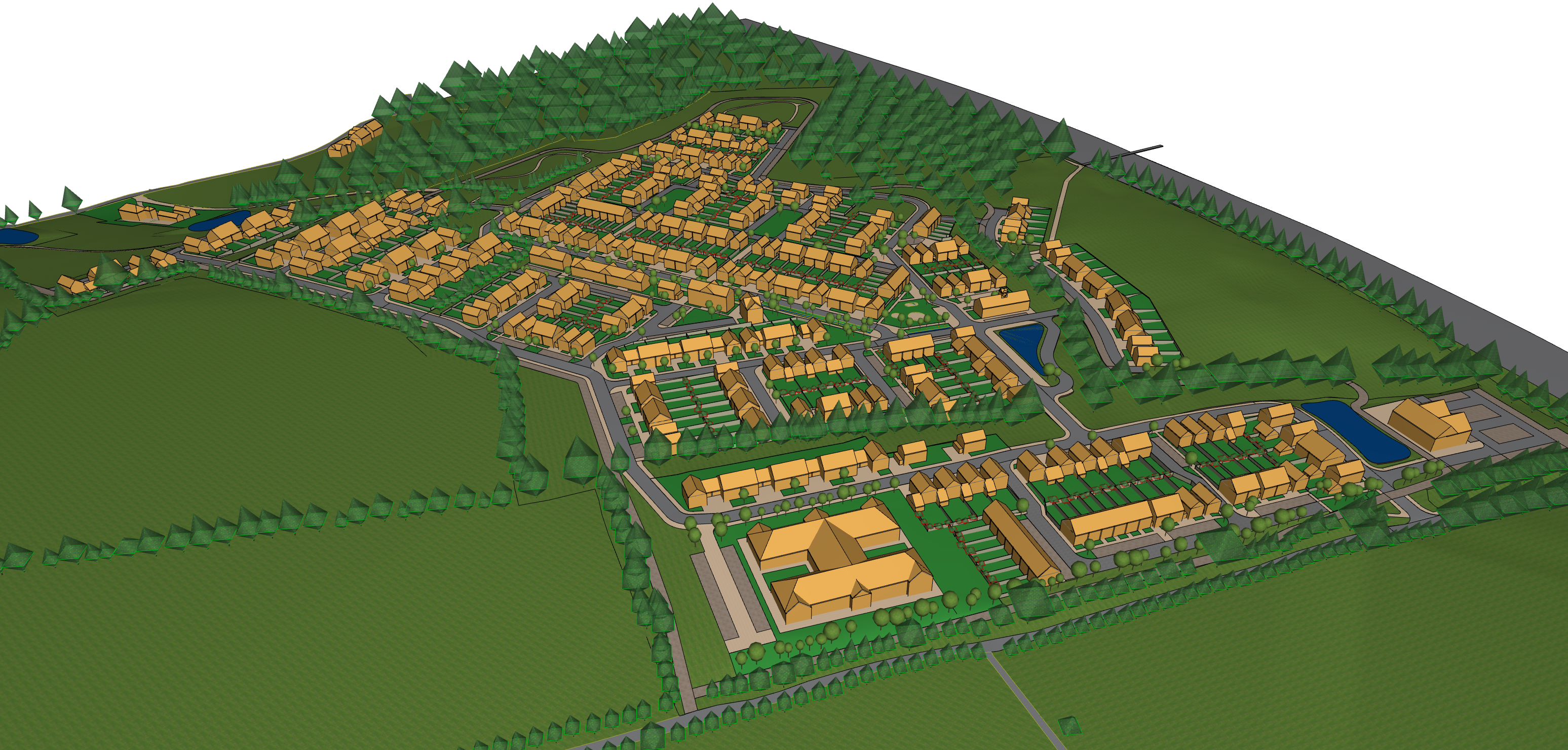 render a lush vibrant aerial view of a quaint village surrounded by rolling hills and dense forests the houses are charming with warm terracotta roofs and muted beige walls the winding roads are a soft natural gray highlight the verdant fields with various shades of green showcasing the richness of the countryside accentuate the trees with deep green hues and the small ponds and water bodies with crystal clear blue tones the atmosphere is serene and idyllic capturing the peaceful essence of a countryside retreat on a sunny day architecture