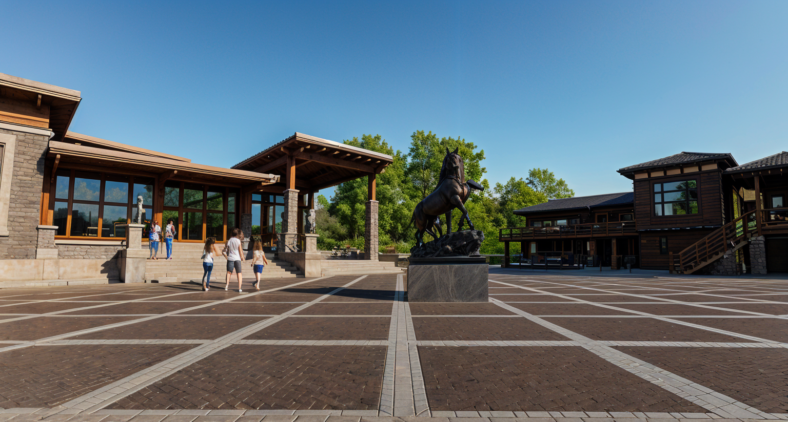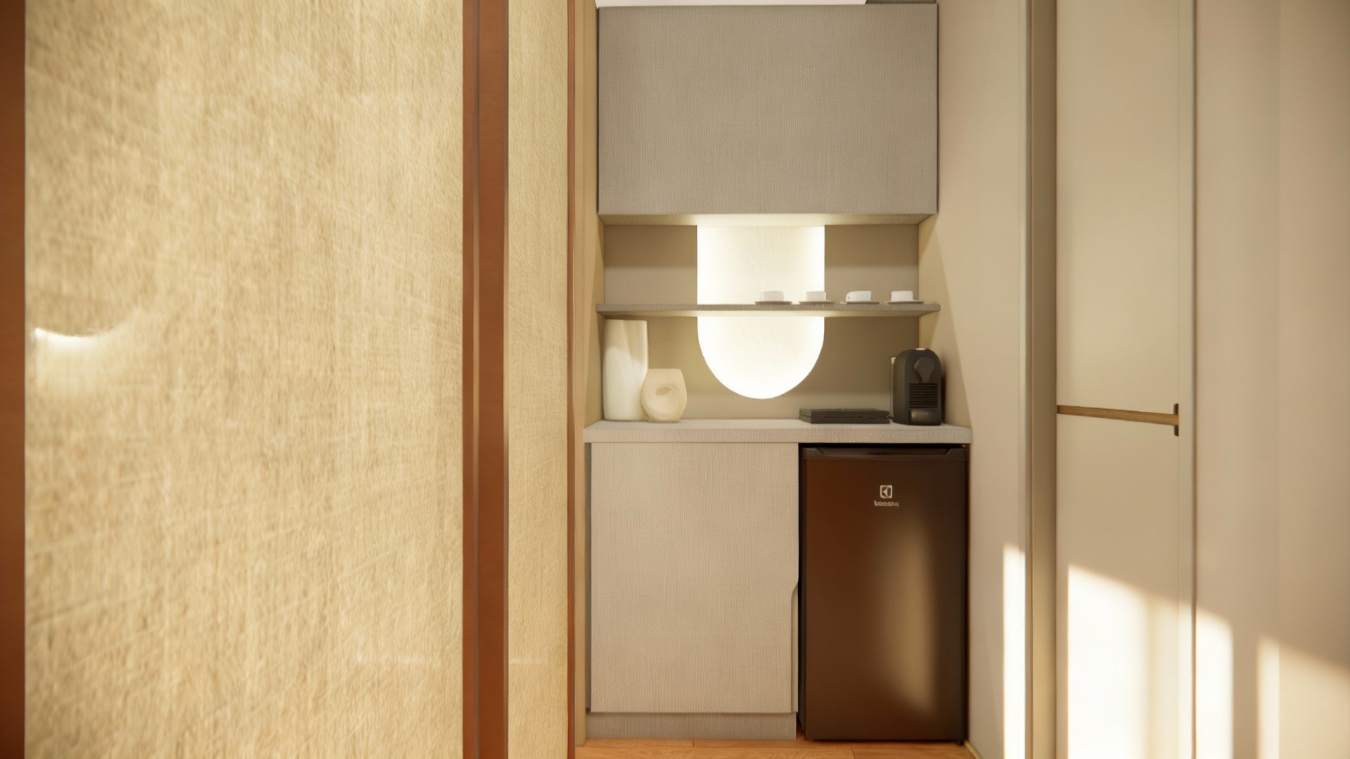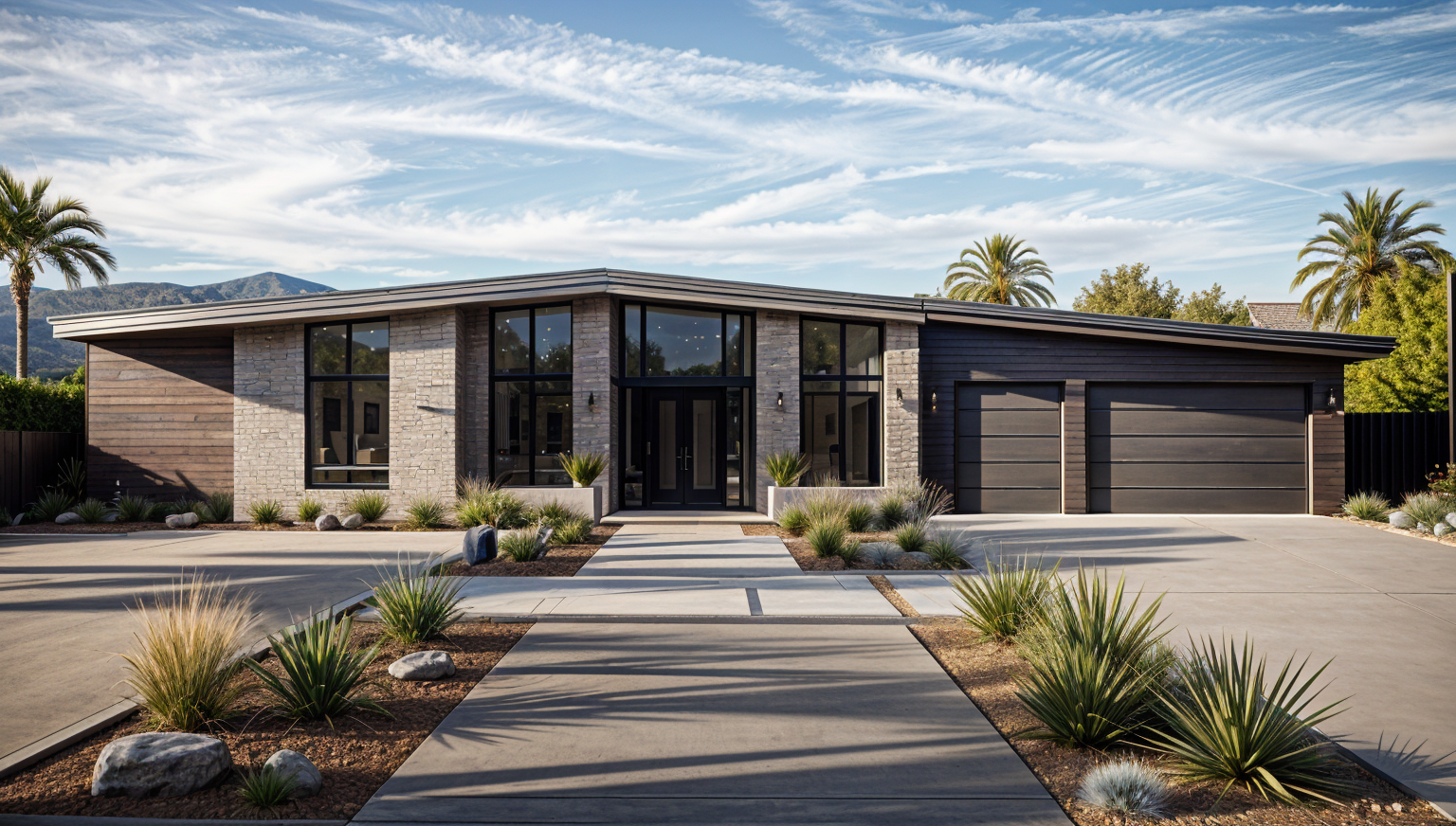 a modern minimalist home with a flat roof the fa ade features a mix of light gray stone and warm wood paneling large sleek black framed windows allow natural light to flood in the driveway and walkway are smooth concrete with pebble accents lined with desert plants like agave and ornamental grasses surround the home with lush greenery and palm trees set against distant mountains the sky is a clear bright blue suggesting a serene sunny afternoon the atmosphere is peaceful and inviting perfect for a tranquil suburban lifestyle architecture