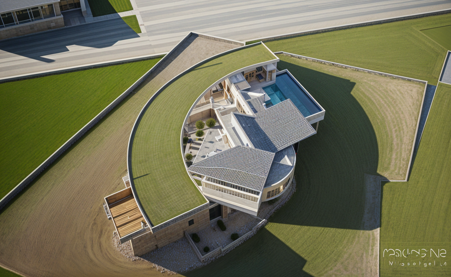 sustainable design rooftop shot use nature material wood stone concrete coziness and greenery set in the evening with soft gentle sunlight make it a community center make roofs curvy architecture