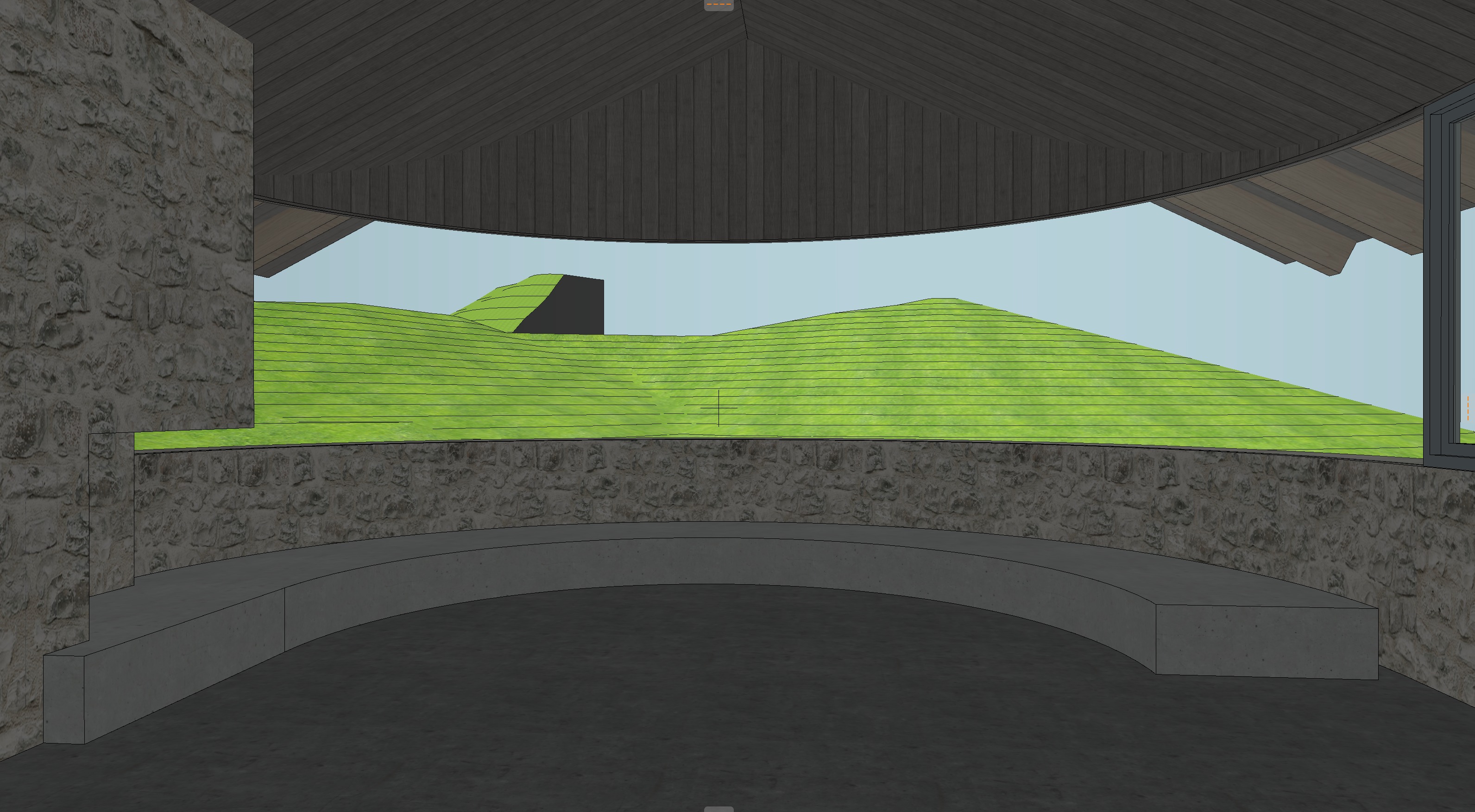 landscape hillside with sagebrush and ta ll wild grasses brown drystack stone walls wide plank wood floors cushions on curved bench add curved windows on top of stone wall