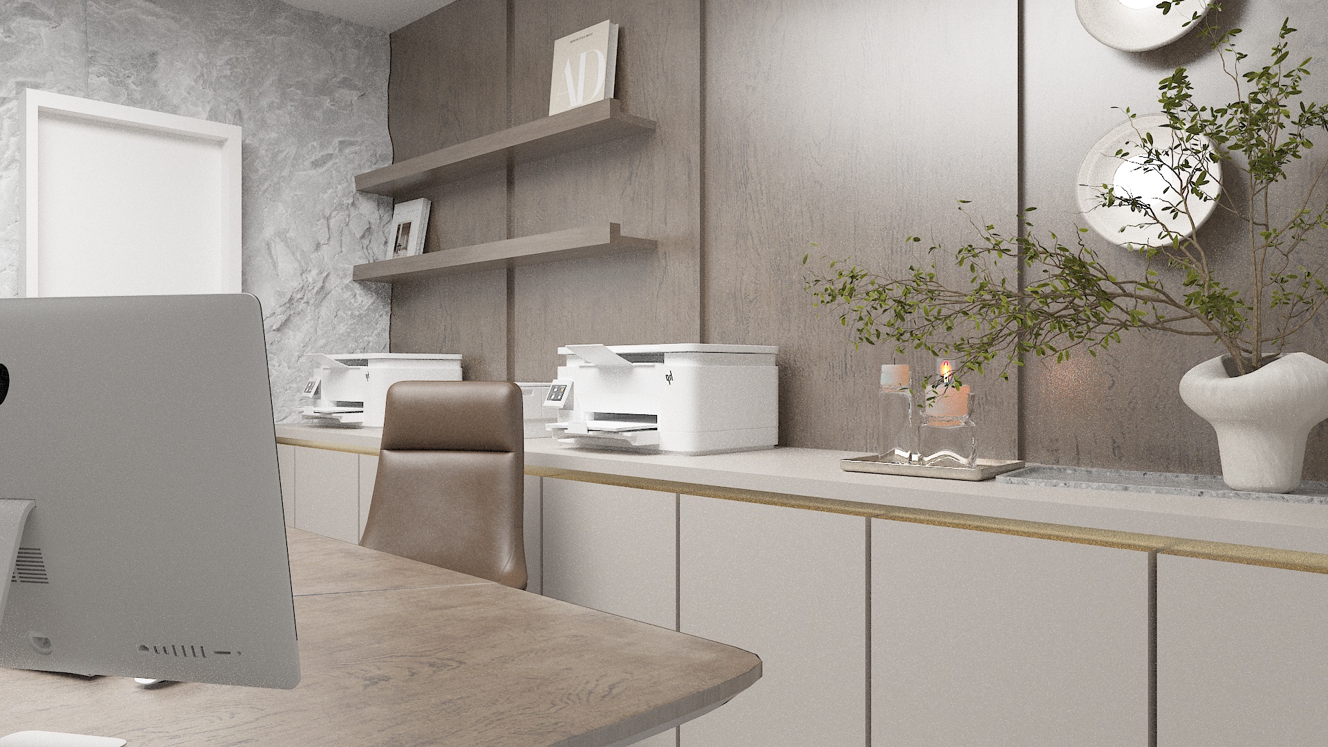 create hyper realistic rendering put all the wooden elements in the picture in an inconspicuous wood decor i want to achieve an elegant and sophisticated office look the rock on the wall should be realistic and the gold details sophisticated the leather material on the chairs is realistic and high quality realistic plant in a vase discreet light on wall lamps and linear pendants above the table golden hour ligtening soft shadows and realistic reflection do not change image and do not add new elements do not change colours and materials