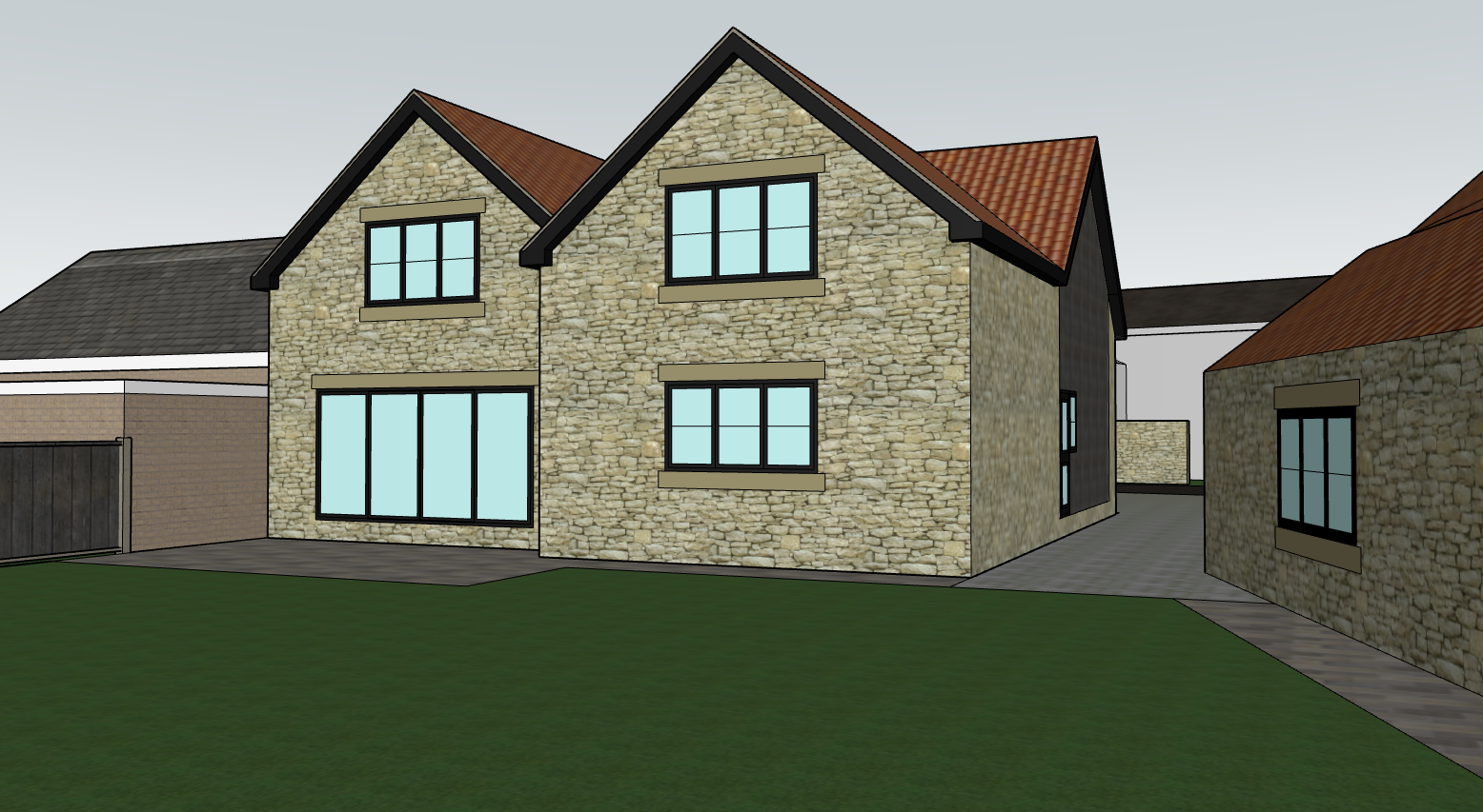 black windows doors fascia and soffits timber cladding to the side elevation cut lawn grass table and chairs to the patio near doors