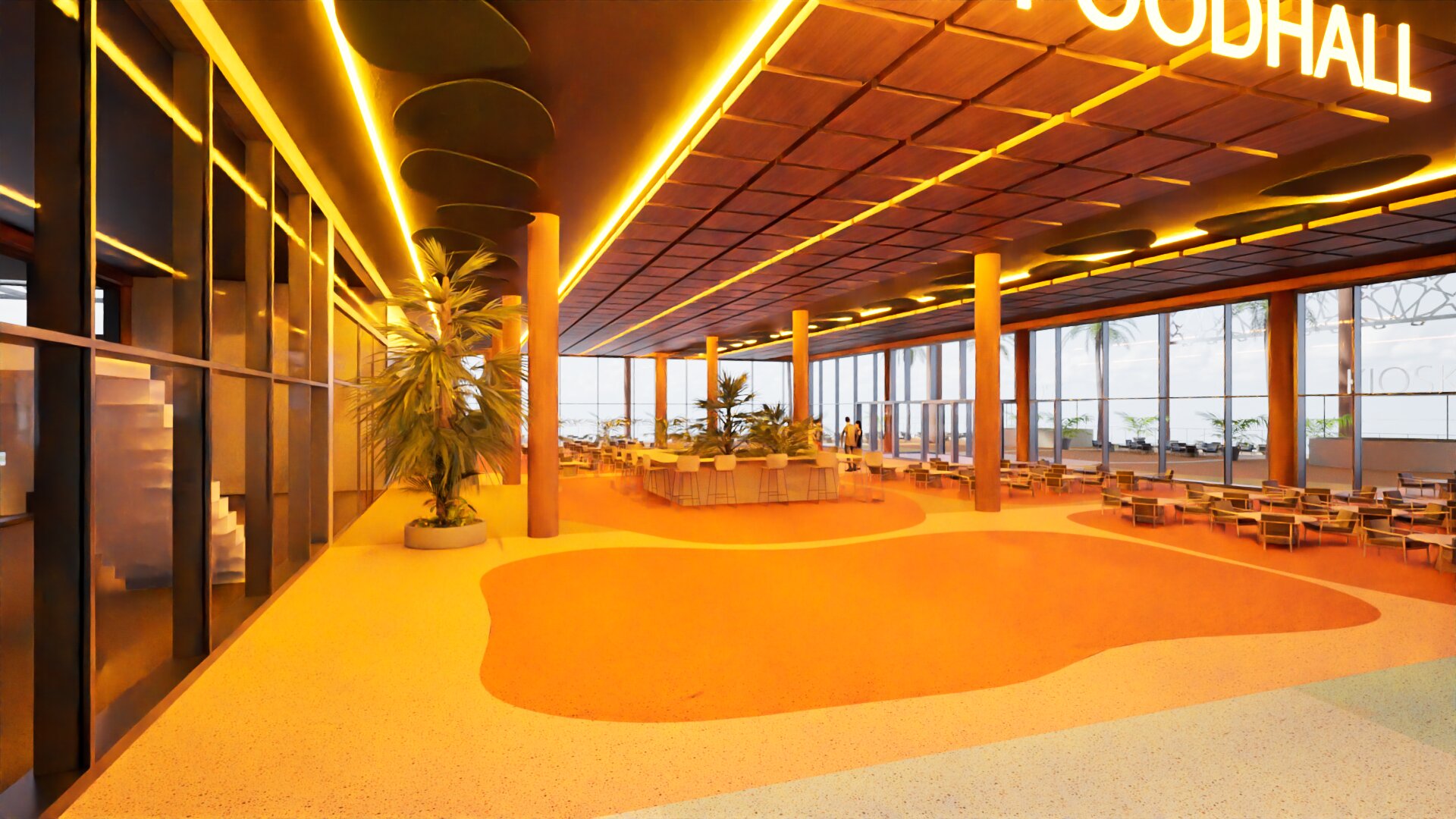 the image depicts a modern interior space with a futuristic design featuring large windows a yellow and orange color scheme and a combination of seating and standing areas the ceiling is adorned with circular patterns that are acoustic panels and recessed lighting contributing to a high tech ambiance there are many people sitting eating reading or using laptops the lighting is more subdued while retaining orange hues there is also vegetation mainly in pots