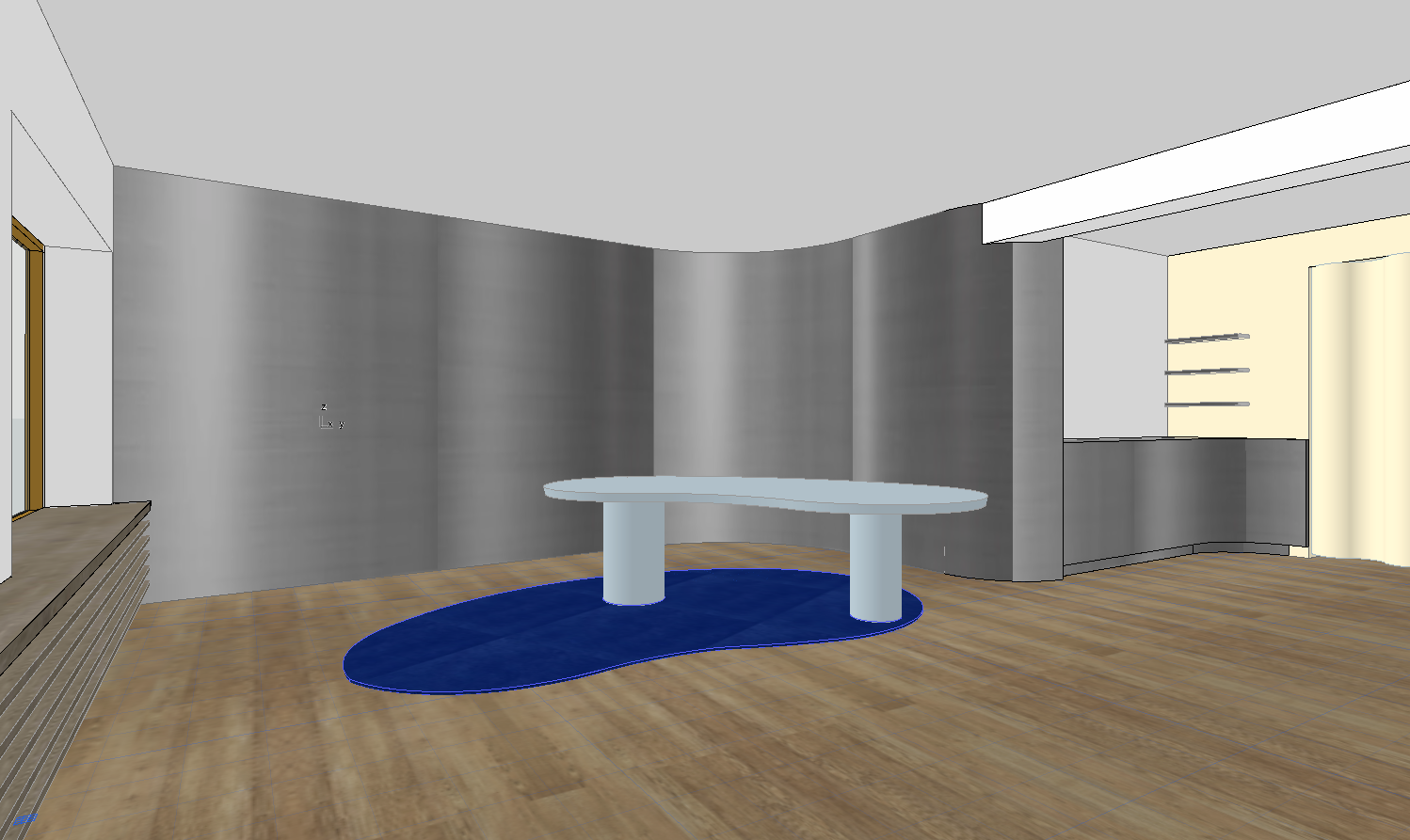 exterior shot combine the reference image and the moodboard keeping the exact geometry and layout of the original design the table should be finished in a light blue tone as shown in the moodboard maintain the color palette with soft butter cream and warm yellow tones combined with the wooden floor ensure five chairs are placed around the table using a mix of the three chair types provided in the moodboard keep all architectural elements unchanged especially the curved kitchen geometry and layout at the right edge of the kitchen include a curtain in a soft buttercream light yellow tone this curtain is an important design element and should clearly frame the space use warm natural daylight entering the space creating a soft inviting atmosphere materials should feel high end and realistic with a subtle contrast between cool metal surfaces and warm tones the overall result should be a refined luxurious interior rendering with a calm and balanced composition