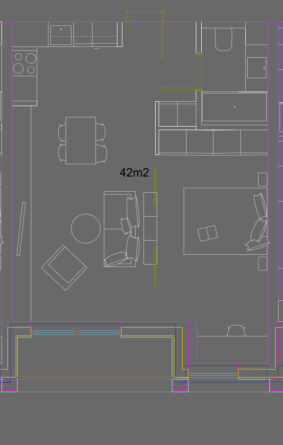 top down architectural floor plan render of a one bedroom apartment 42 sqm photorealistic 3d bird s eye view japandi scandinavian style overall color distribution 60 light clean wood tones knot free smooth grain uniform pale blonde 35 pure white surfaces 5 very subtle earthy tones on upholstery freestanding furniture and rugs only light blonde whitewashed knot free hardwood flooring with vertical planks throughout living dining and bedroom zones kitchen floor finished in smooth extra light beige microcement seamless matte pore free surface with subtle trowel texture no joints or grout lines extremely pale almost white beige bathroom floor finished in the same microcement seamless matte clear visual boundary between microcement zones and wood floor zones layout based on provided floor plan open plan space l shaped kitchen occupying the entire top left corner with induction hob 4 burners integrated sink along the left wall pure white smooth matte countertop extractor fan above hob kitchen runs along both the top wall and left wall forming a clear l shape main entrance door located at the top wall center left position shown fully closed bathroom located in the top right corner with white freestanding bathtub white toilet against the right wall white walls and microcement floor a full height built in wardrobe closet with smooth pale wood sliding doors placed along the wall adjacent to the bathroom rectangular dining table with chairs positioned in the upper center area of the main room in clean knot free very light blonde wood living area occupying the bottom left zone with an area rug off white sofa off white armchair round pale wood coffee table wall mounted tv panel on the left wall bedroom zone in the bottom right with queen size bed with white bedding headboard in clean pale wood one pale wood nightstand large glazed sliding doors balcony access along the entire bottom wall a vertical dividing line partial wall or visual separator runs from top to bottom near center separating the living zone left from the bedroom zone right as shown in the plan all doors throughout the apartment are shown fully closed no door swing arcs no open door indicators no partial openings anywhere main entrance door closed bathroom door closed all interior doors closed wardrobe sliding doors closed clean straight door lines only visible as thin gaps in the walls walls constructed from exposed cross laminated timber clt smooth knot free clean pale blonde layered wood grain on all wall surfaces no knots no dark spots no imperfections perfectly uniform light wood lamination lines only clt wall thickness visually prominent in top down view showing clean layered cross section pattern at wall ends strict color palette rule 60 smooth clean pale blonde knot free wood 35 pure white 5 ghost earthy tones on upholstery and rugs only so desaturated they are nearly white with only the faintest whisper of terracotta clay sage or olive remaining everything blends into a near monochromatic pale palette zero vivid saturated or synthetic colors anywhere lighting soft flat diffused overcast ambient lighting with no directional light source no harsh shadows no sunlight pools no light gradients across the floor uniform low intensity illumination across the entire plan only very subtle ambient occlusion beneath furniture legs under the bed frame and in wall corners shadows are extremely faint soft and barely visible no specular highlights no reflections no light bouncing overall mood calm dim evenly lit like an overcast day low brightness low contrast lighting throughout realistic material rendering smooth knot free light blonde floor texture in living and bedroom zones extra light almost white warm beige seamless matte microcement in kitchen zone very light beige seamless matte microcement in bathroom zone pale clean clt wall grain pure white smooth matte countertop fabric micro texture on sofa and rugs matte ceramic finish on toilet and tub ultra realistic high detail cgi render orthographic top down view 8k resolution