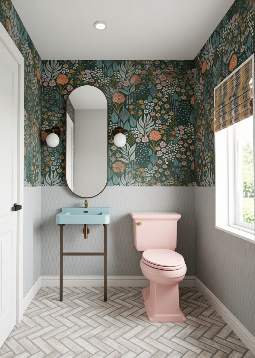 large transitional kitchen interior eye level perspective looking straight toward the island balanced and symmetrical composition kitchen features full height perimeter cabinetry in a soft muted green gray tone with a matte painted finish cabinet doors are classic shaker style with clean recessed panels and subtle frame detailing all cabinetry hardware is in a warm brushed brass finish including pulls and knobs on the left wall tall integrated cabinetry with two panel ready refrigerators fully clad in matching millwork panels seamless and flush with surrounding cabinets adjacent tall pantry style cabinets continue the same finish and detailing the back wall features additional upper and lower cabinets in the same color and style with a full height light stone slab backsplash in a soft off white tone with subtle natural veining continuous and uninterrupted behind all cabinets centered in the space is a large rectangular kitchen island the island base is finished in natural light oak wood with visible vertical grain and flat recessed panel detailing the island countertop is a light stone surface with soft veining slightly eased edges clean and minimal one side of the island includes integrated drawers with brass pulls the opposite side is a solid wood panel on the right side of the island three counter height stools with slim black metal frames and upholstered seats and backs in a muted green fabric are neatly aligned above the island hang two pendant lights each with a warm brass canopy and stem the pendants feature a pleated fluted white shade in a wide conical shape softly diffusing light downward flooring throughout the kitchen is wide plank natural oak wood flooring in a light neutral tone with subtle variation laid straight and evenly ceiling is white with multiple evenly spaced recessed round downlights providing soft even illumination no dramatic shadows neutral daylight balanced lighting on the right wall lower cabinets with drawers and upper cabinets above all in matching finish a window with white trim is centered above the counter dressed with a woven roman shade in light neutral tones at the far end of the kitchen a doorway leads to a pantry or secondary space with cabinetry visible beyond in a slightly darker green tone overall style is clean refined transitional with subtle traditional detailing no people no styling accessories added no changes to colors materials proportions layout or lighting architectural illustration style with clean outlines and accurate scale