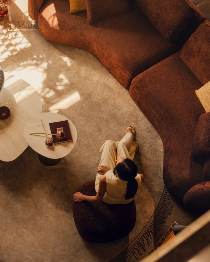 change the color lighting and overall mood of the image of sofa from above to match the reference image