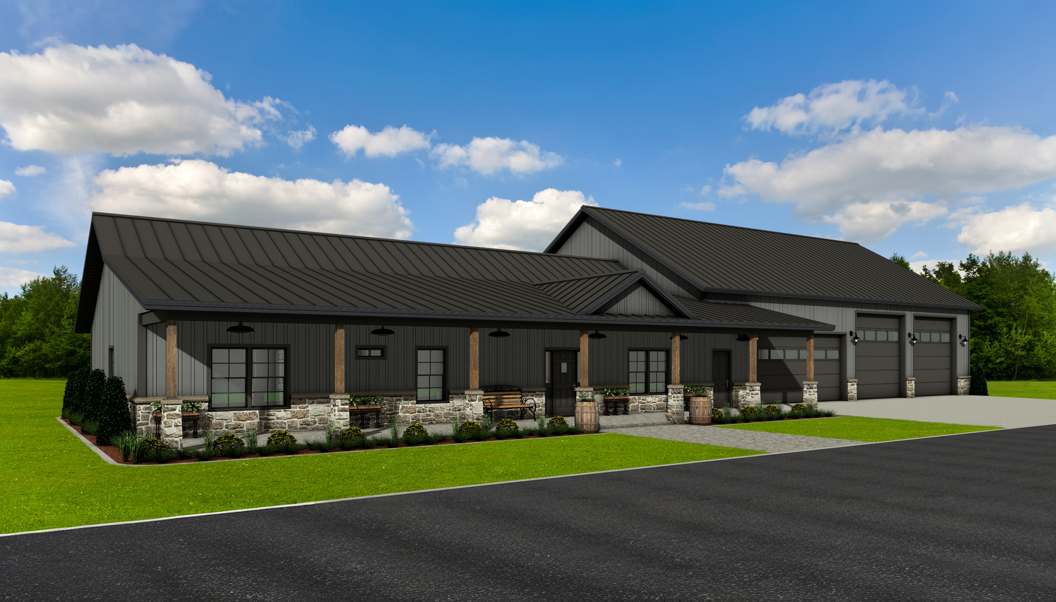a modern house retain the exact structure colors and window arrangement rooflines siding foundation height and proportions exactly as shown in the reference image integrate into the terrain there are just a few trees mixed hardwoods that are mostly on the sides of the image add cooler afternoon sunlight subtle dappled highlights across the siding and grass create ultra realistic lighting crisp shadows detailed textures in the siding and glass reflections and an overcast sky show only a few lights visible inside render in hyper realistic architectural visualization quality 8k resolution add a driveway tying into the concrete garage door apron make it the summer season add realistic landscape
