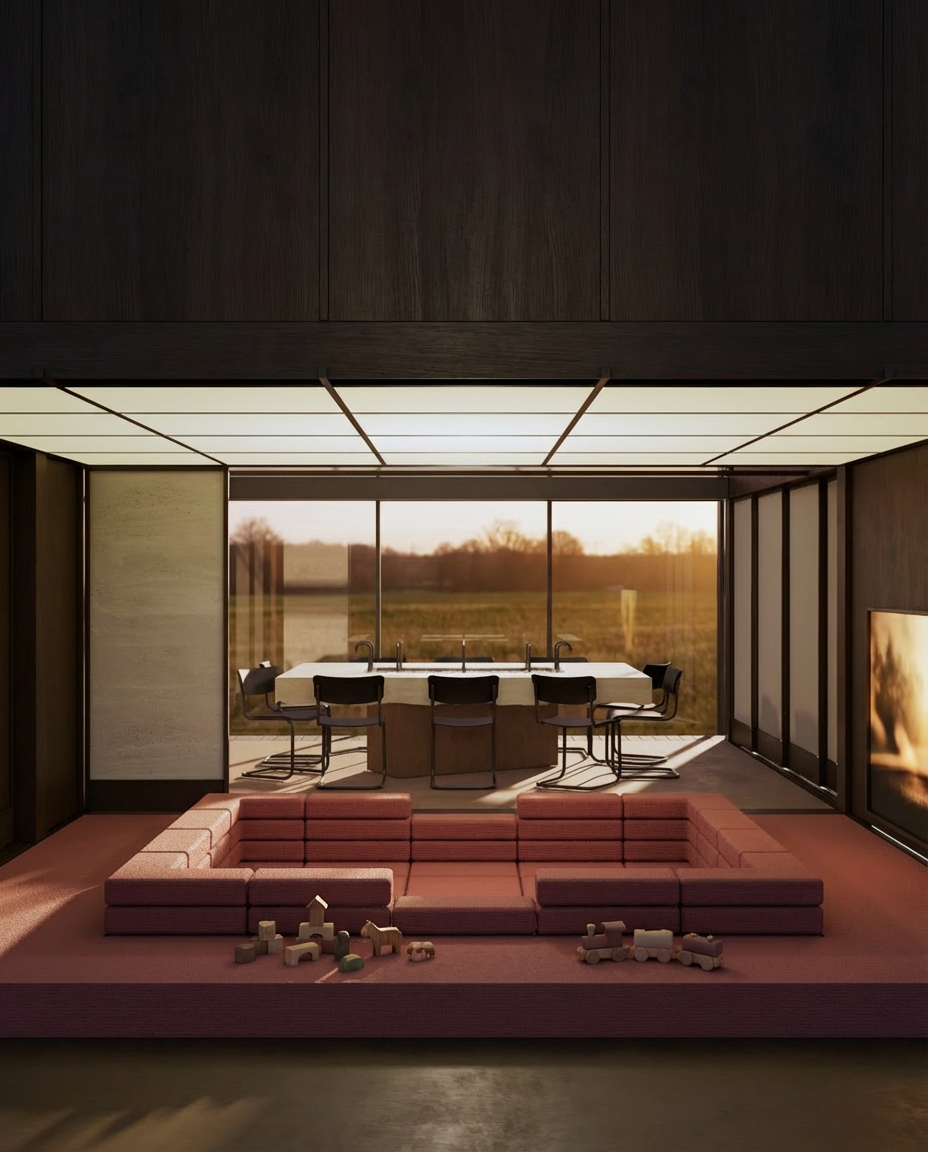 turn on scree add small timber children toys on the carpet and sofa add some fruit on the table soft warm light from light panels
