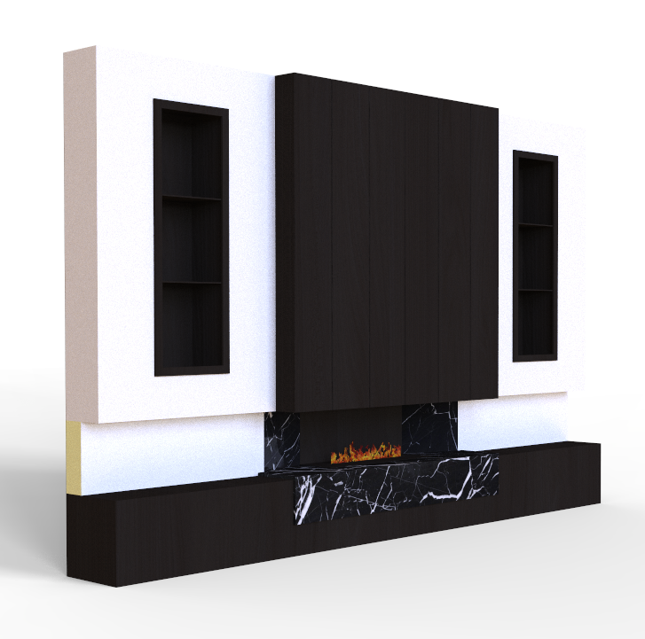 this is a media wall for an interior project please make black wood tones look real and the black marble and the fire as well