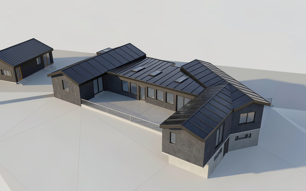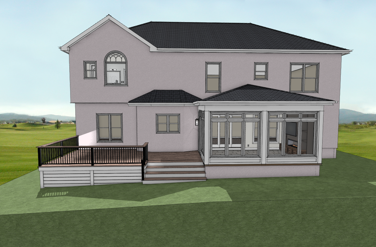 show a composite deck and add a table and grill to deck show powder coated aluminum railing with a composite drink rail on top with ambient lighting coming from underneath the house is a greyish pink stucco and pine needles around the deck and sunroom