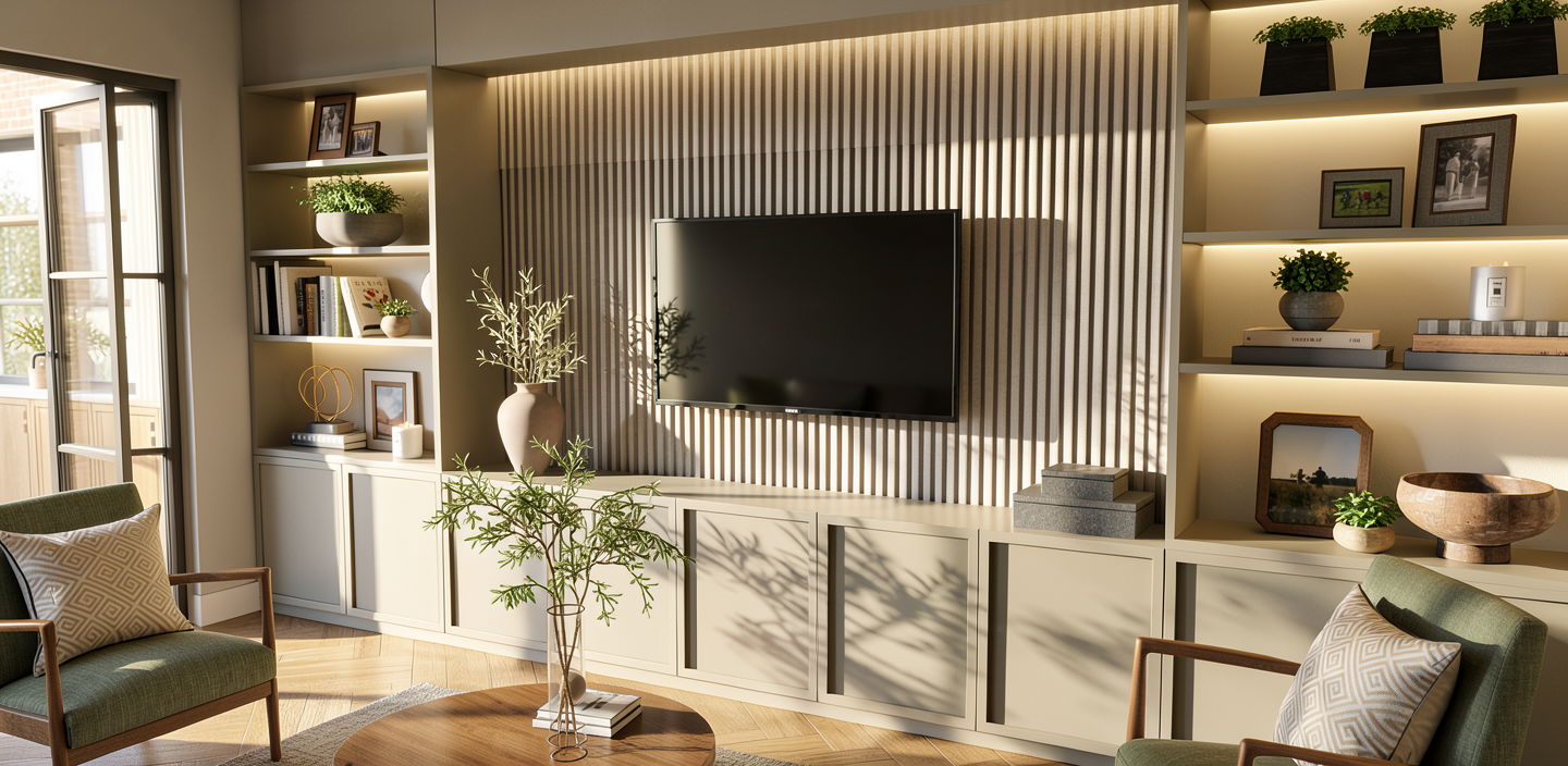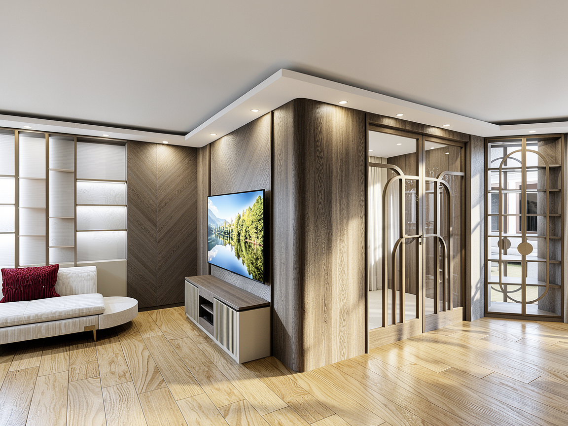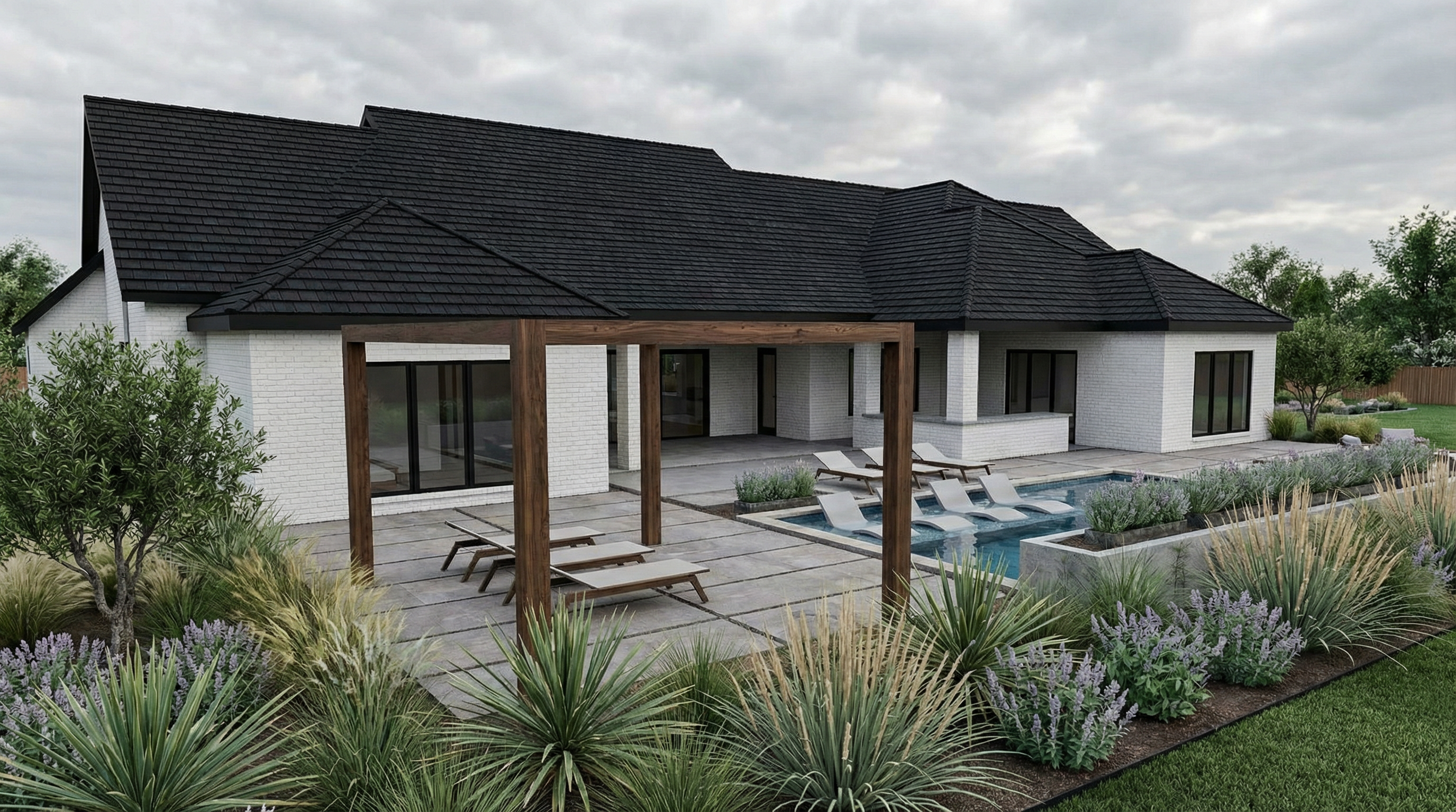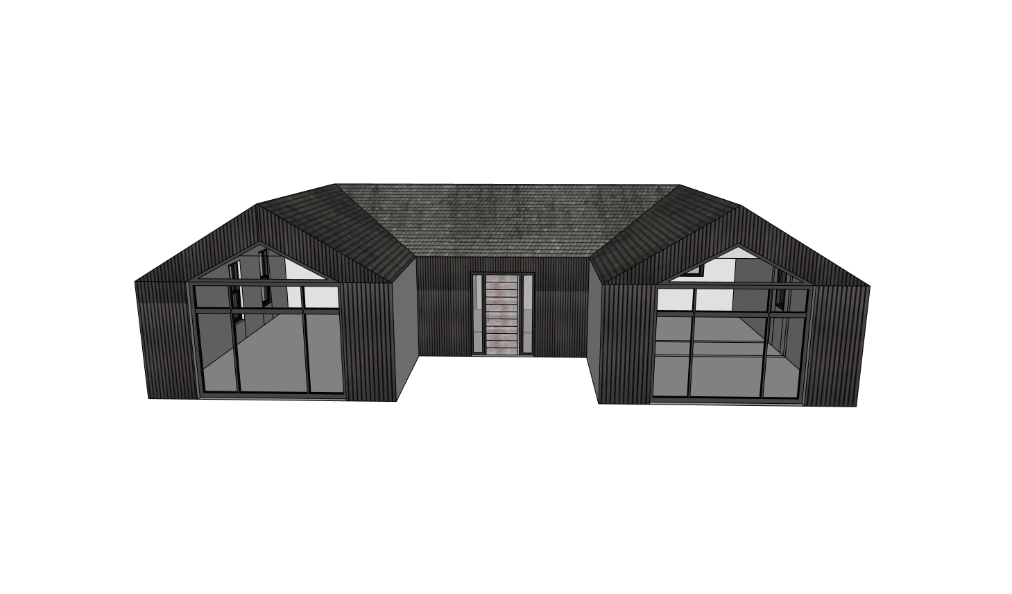 render a modern architectural house with two large glass sections in a u shape use a sleek black for the exterior walls emphasizing a contemporary minimalist aesthetic the roof should have a subtle slate gray texture to add depth for the glass ensure it reflects soft sunlight perhaps in the late afternoon for a warm ambiance the entrance is a wooden door using a rich natural wood grain the atmosphere should be peaceful and serene set in a lush green landscape with soft shadows and a clear blue sky